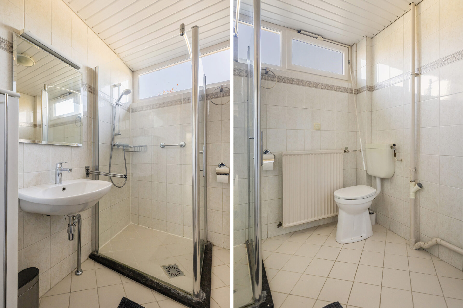 Overloop, drie ruime slaapkamers, waarvan één met vaste wastafel. Geheel betegelde badkamer met douche, tweede toilet en wastafel.