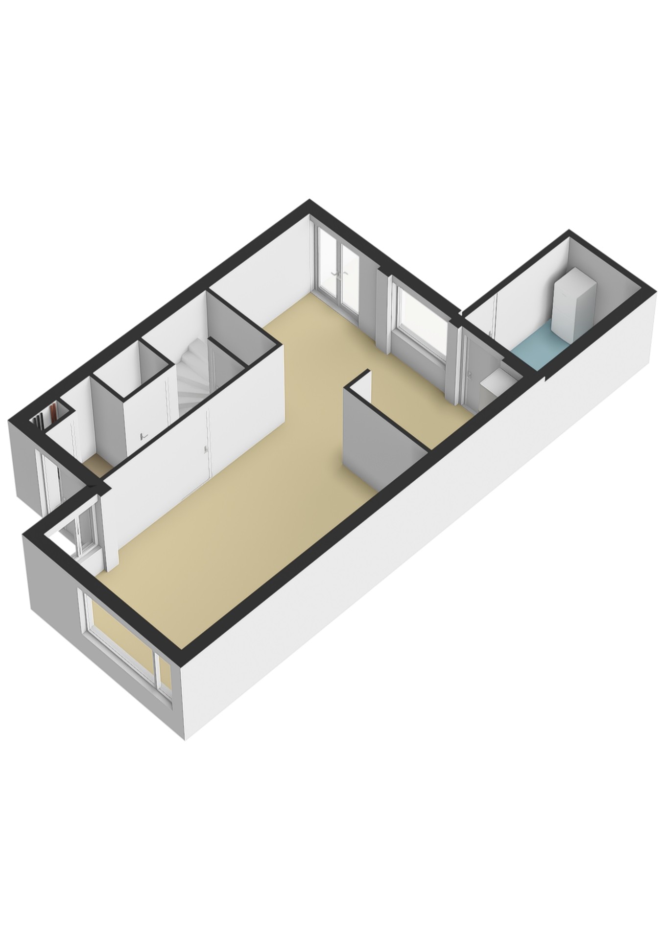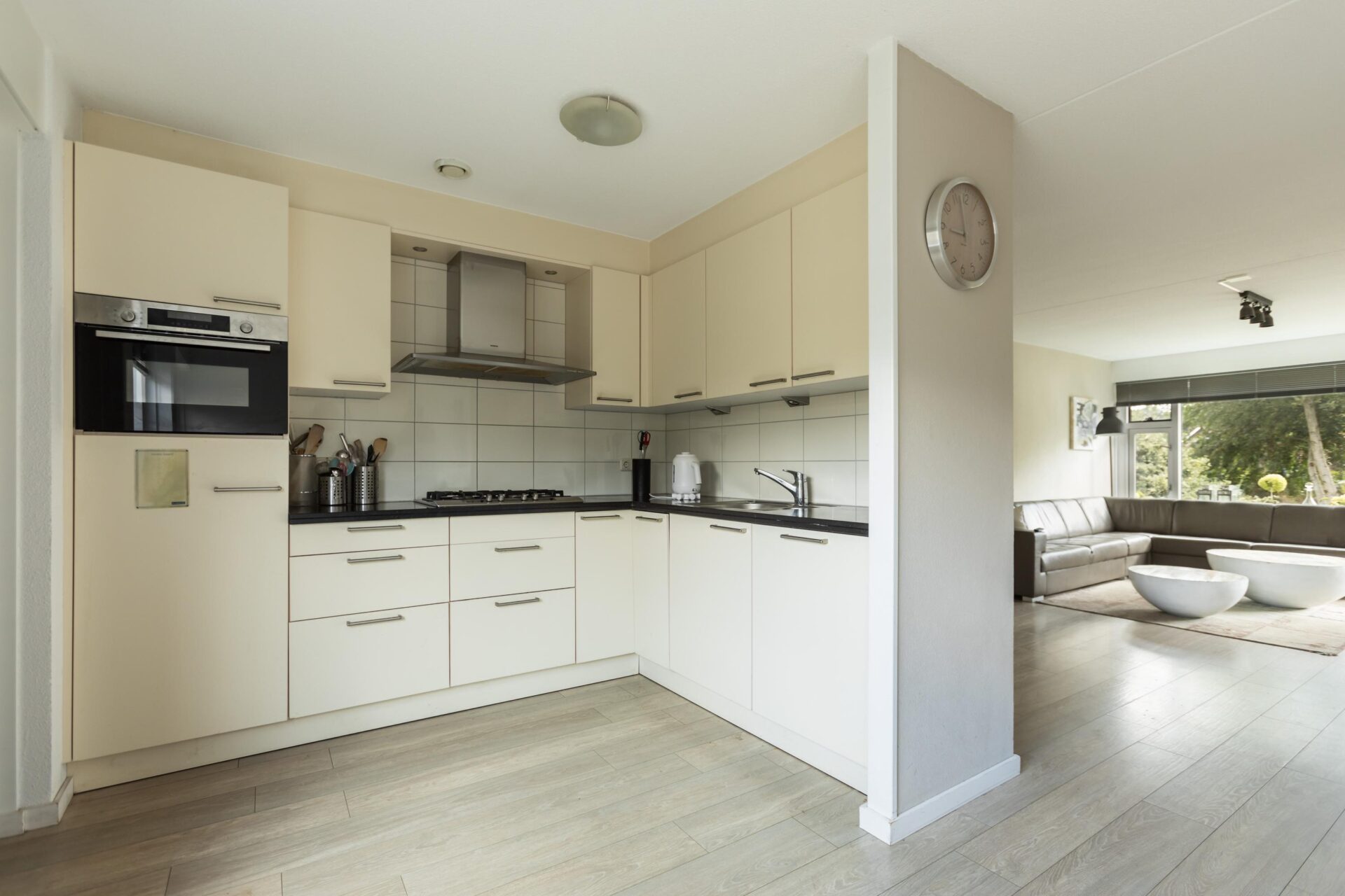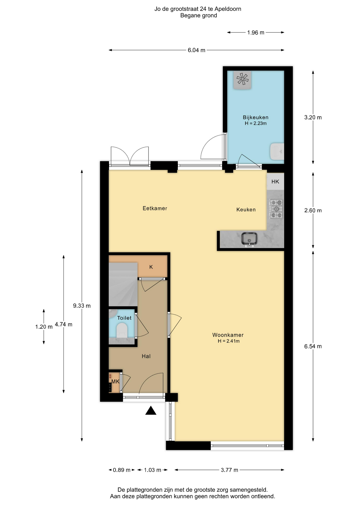 Entree/hal, L-vormige woonkamer met eethoek en keuken aan de achterzijde van de woning, bijkeuken, toilet en trappenkast.
