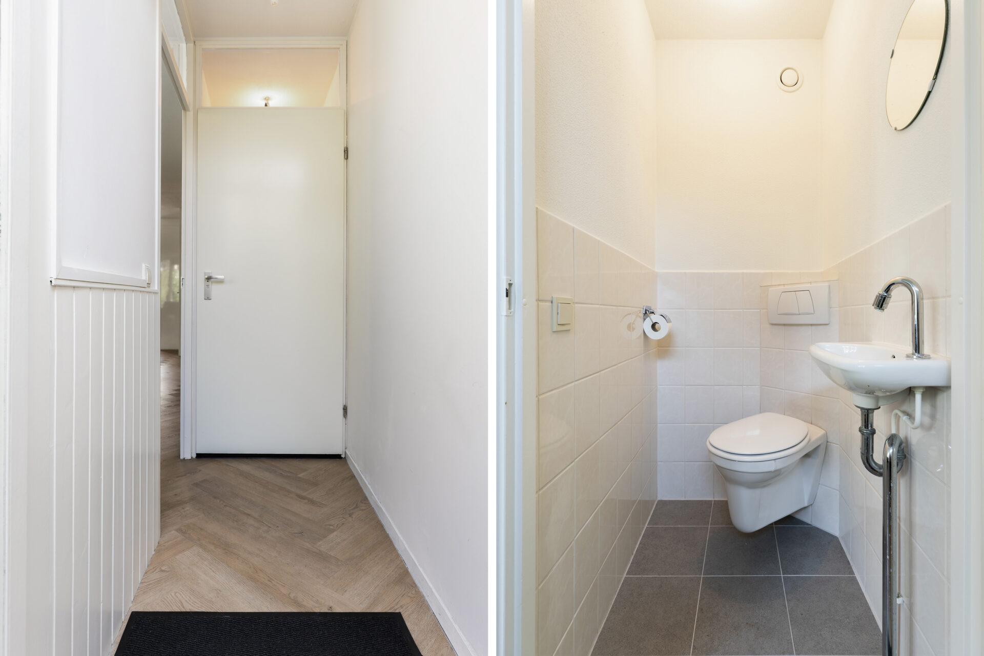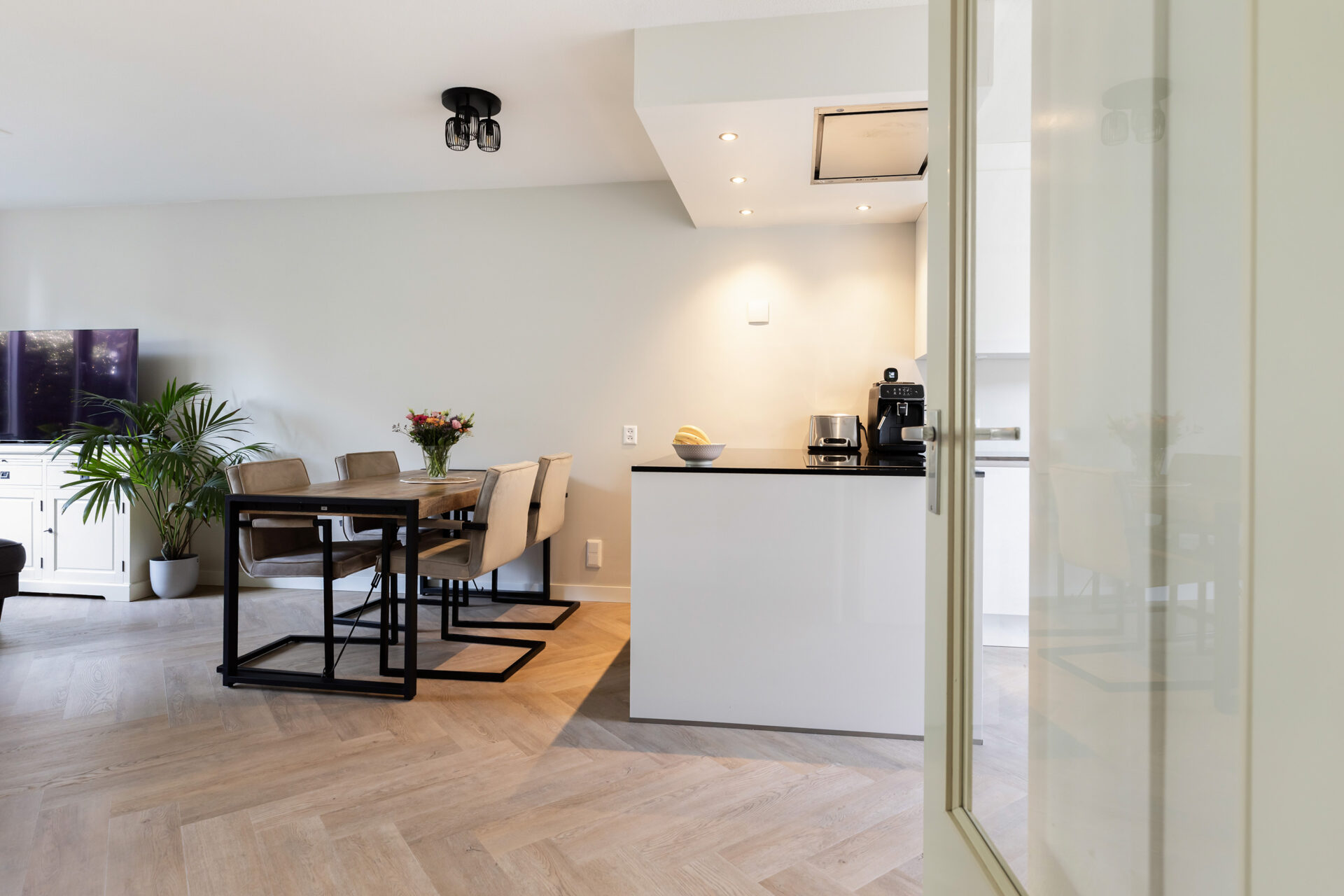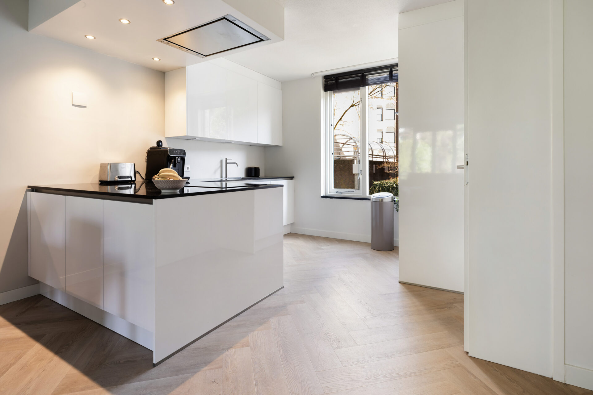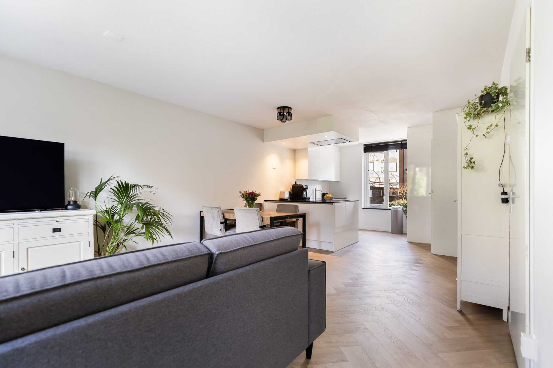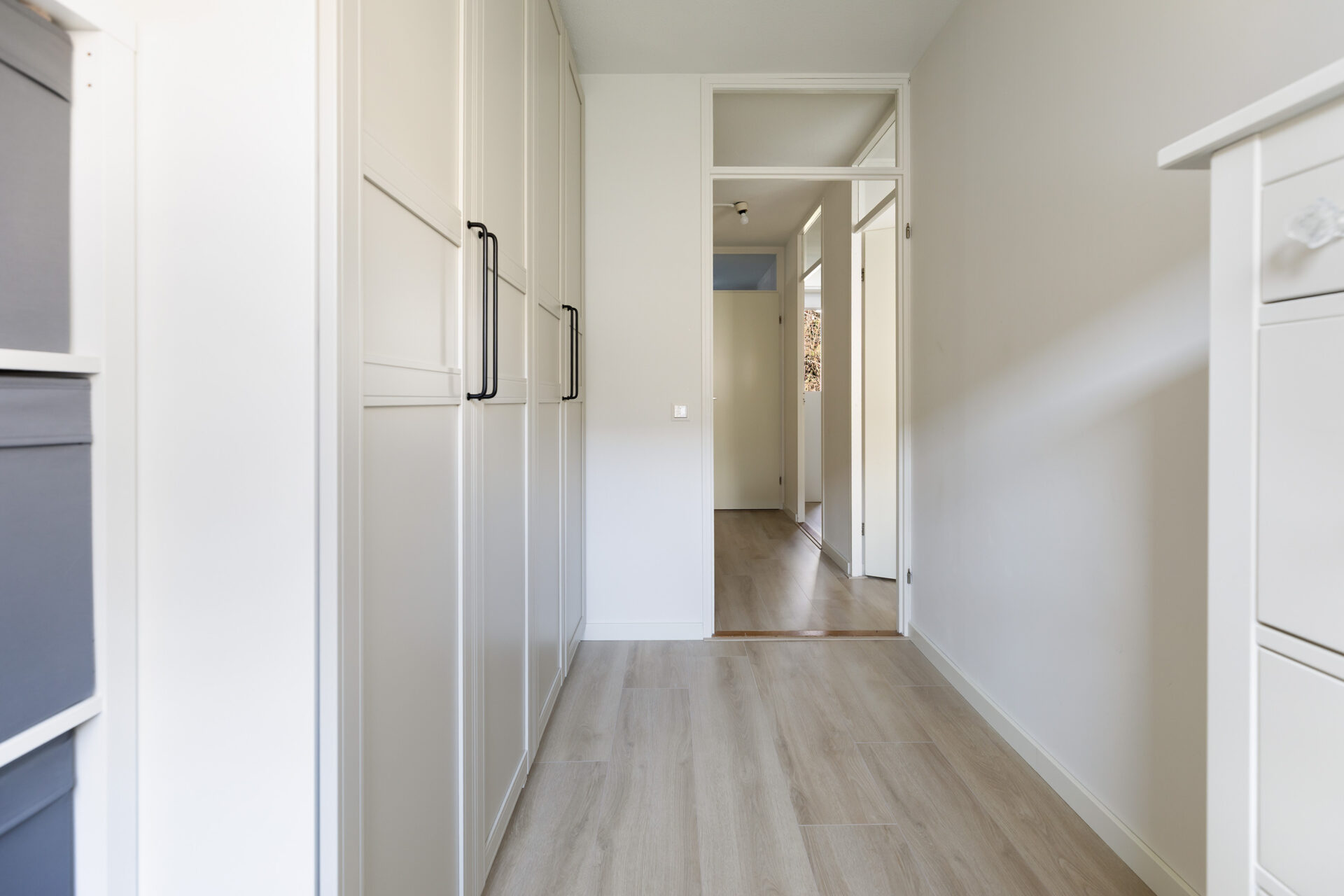 Entree, hal met toegang tot het toilet en woonkamer. De lichte woonkamer beschikt over een praktische inbouwkast en een geeft toegang tot de moderne open keuken voorzien van inbouwapparatuur.