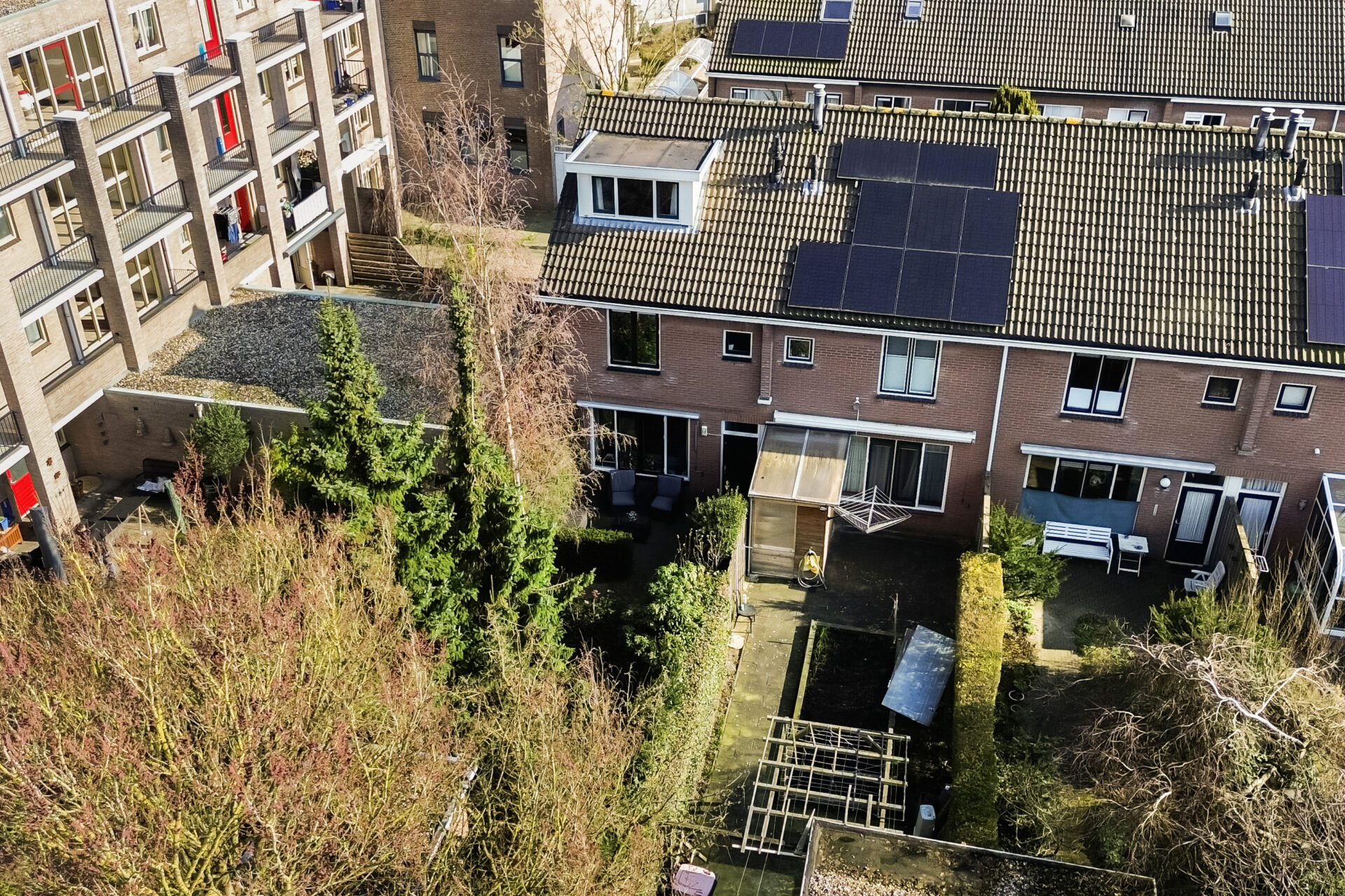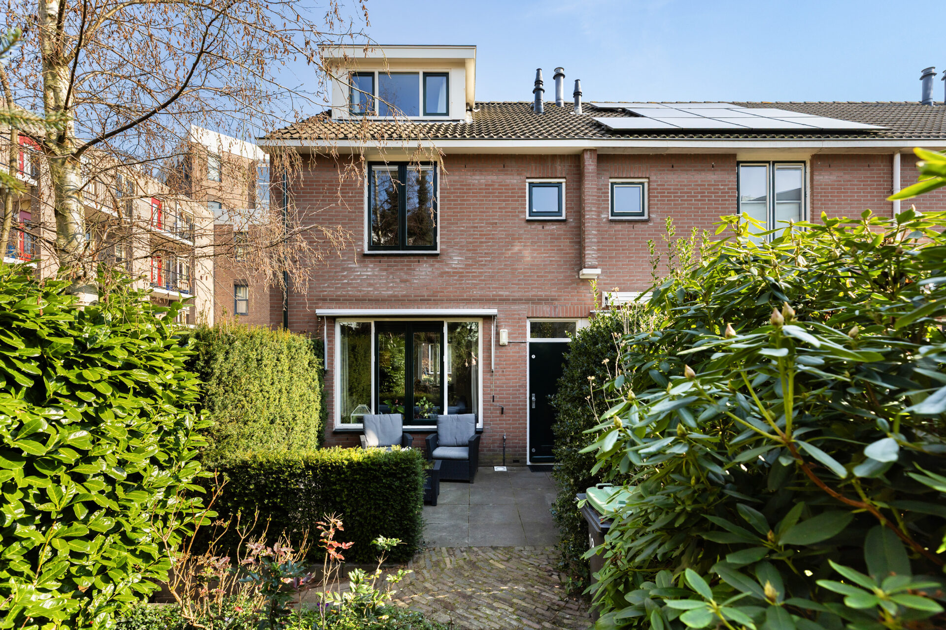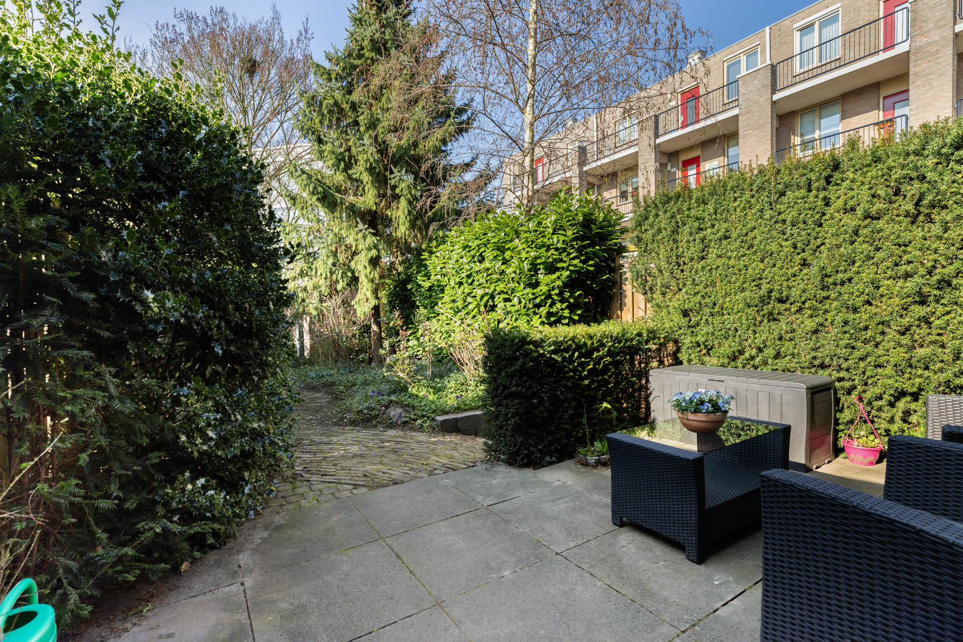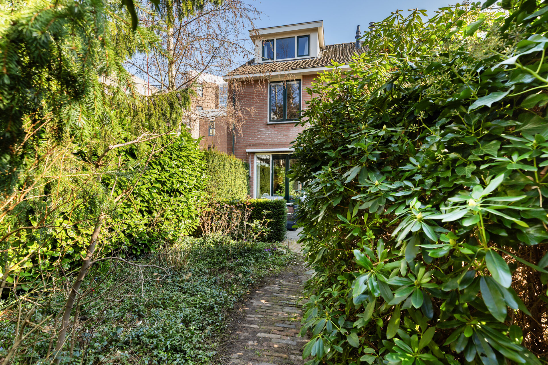De achtertuin is een groot pluspunt: circa 16 meter diep, gelegen op het westen, met een terras, stenen berging en een handig achterom.