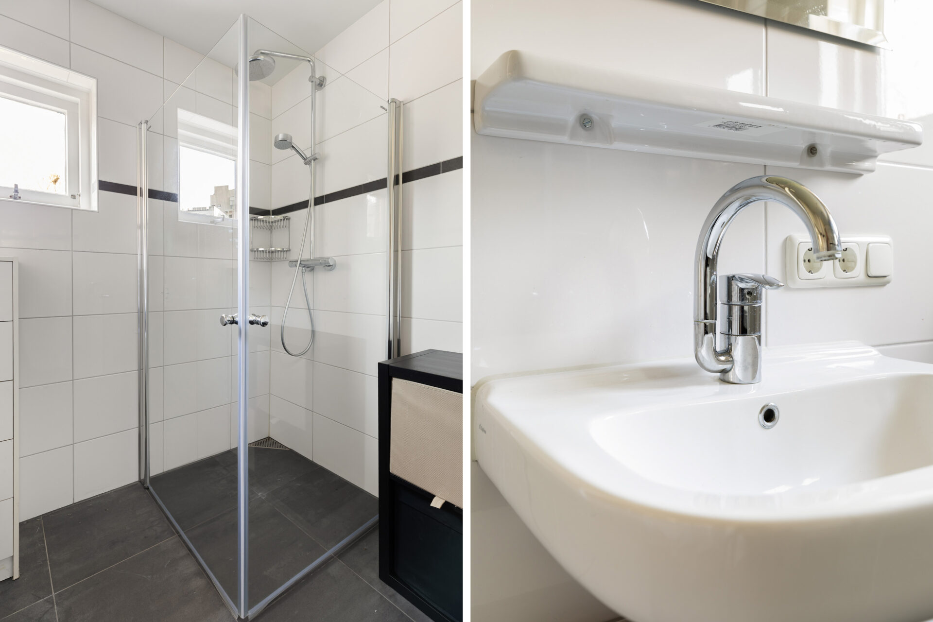 Overloop. Moderne, licht betegelde badkamer voorzien van een ruime douche, wastafel en toilet. Daarnaast zijn er drie slaapkamers, waarvan twee met inbouwkasten.