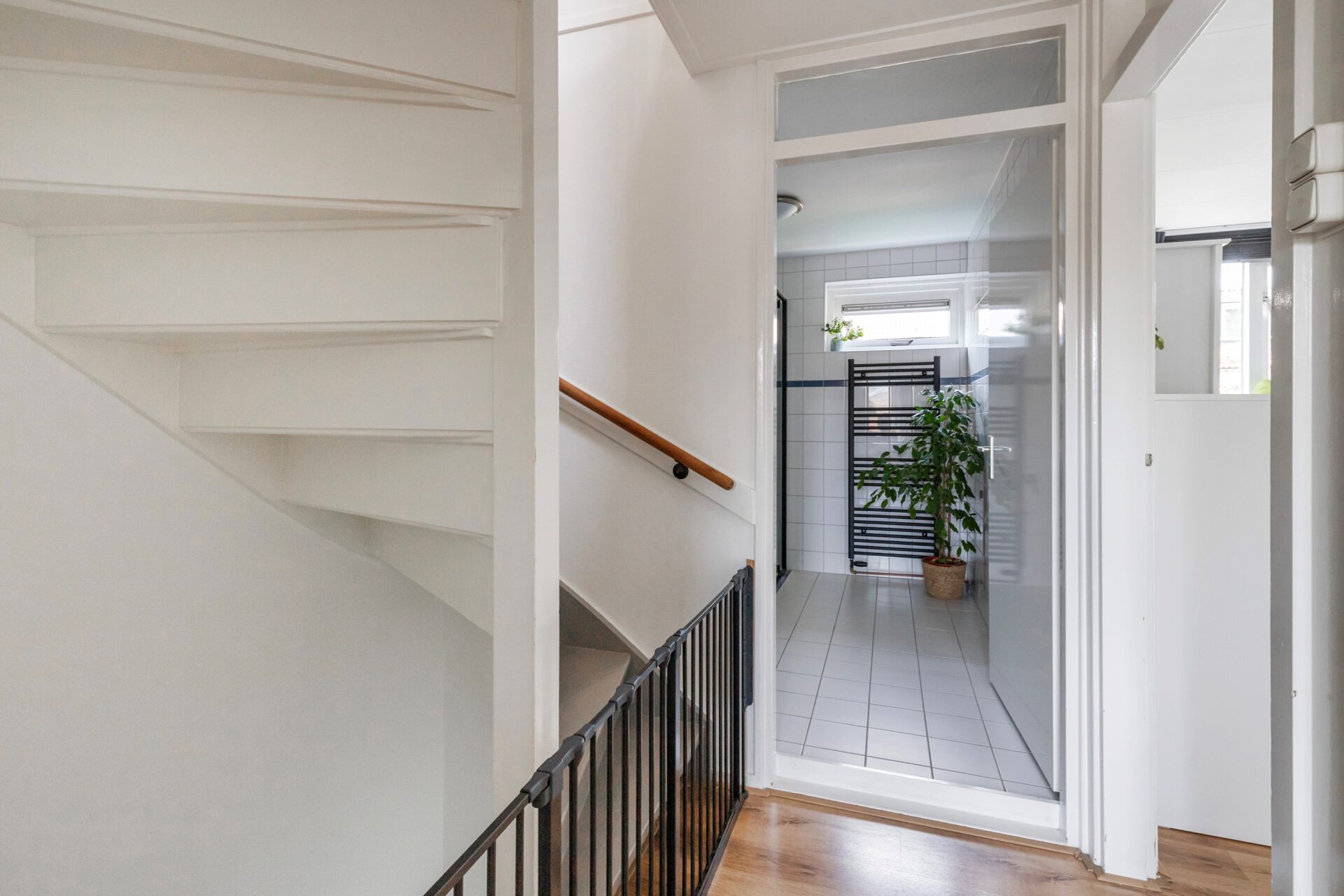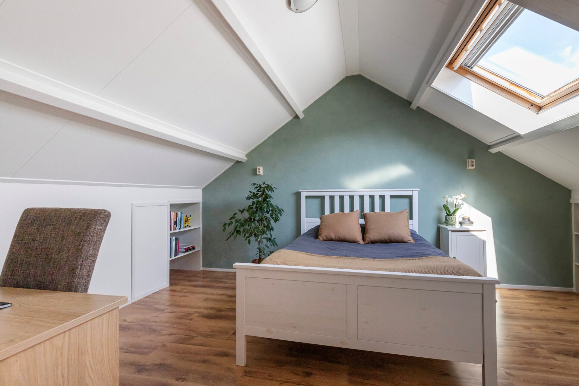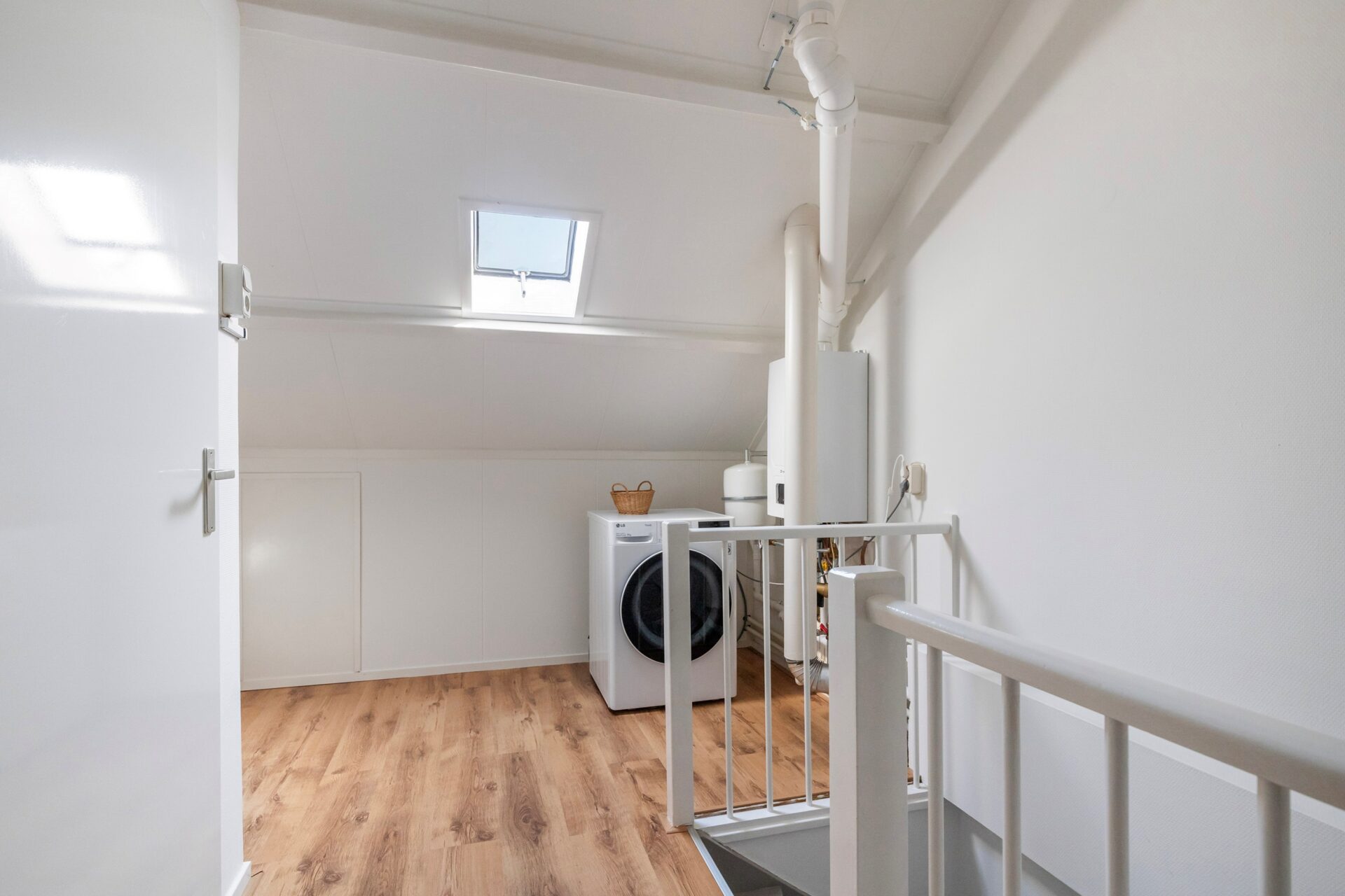 Tweede verdieping: zeer ruime overloop met o.a. de C.V.-ketel en wasmachine opstelling. Op de overloop zit een dakraam waardoor er natuurlijk lichtinval is. Opslagruimte achter schotten. Vierde zeer ruime slaapkamer, voorzien van groot dakraam en aan weerszijden wederom opslagruimte achter schotten.