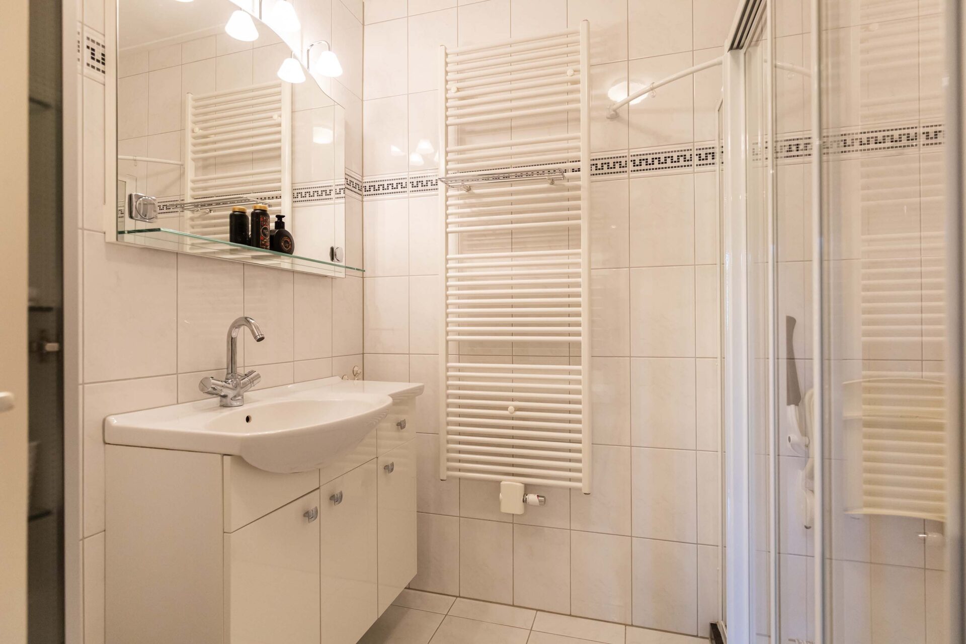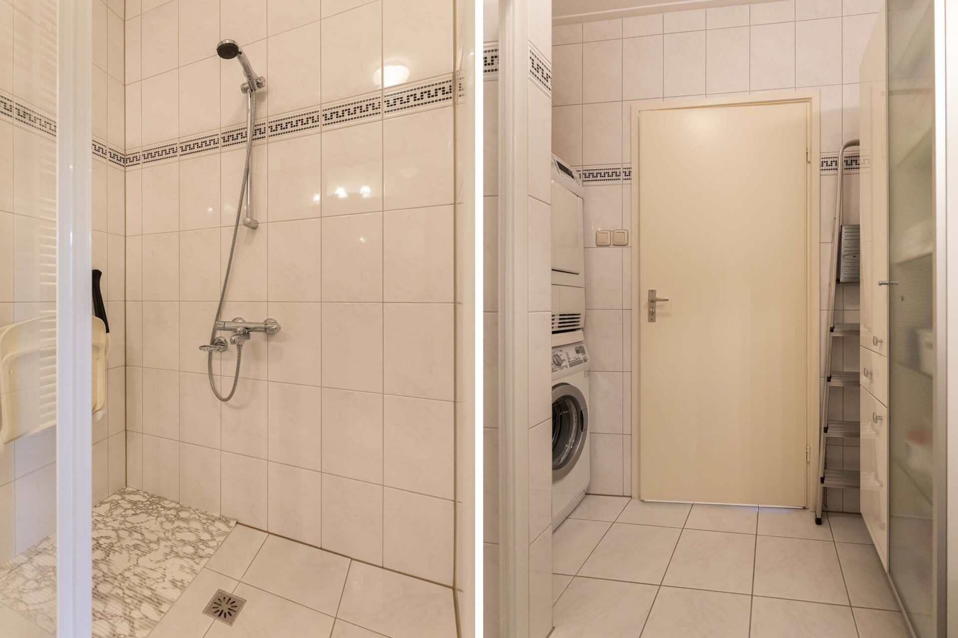 De badkamer is eenvoudig maar netjes en voorzien van een douchehoek, kast, wastafel en aansluiting voor wasapparatuur. Er is een apart toilet aanwezig.