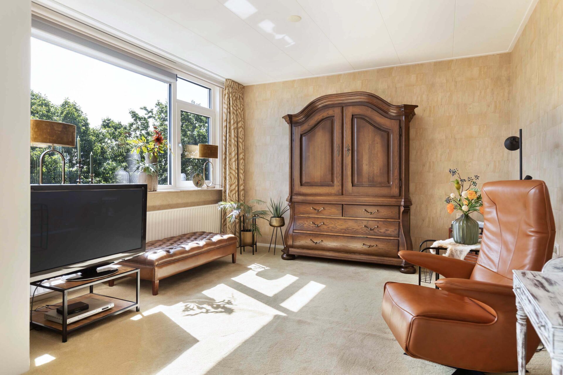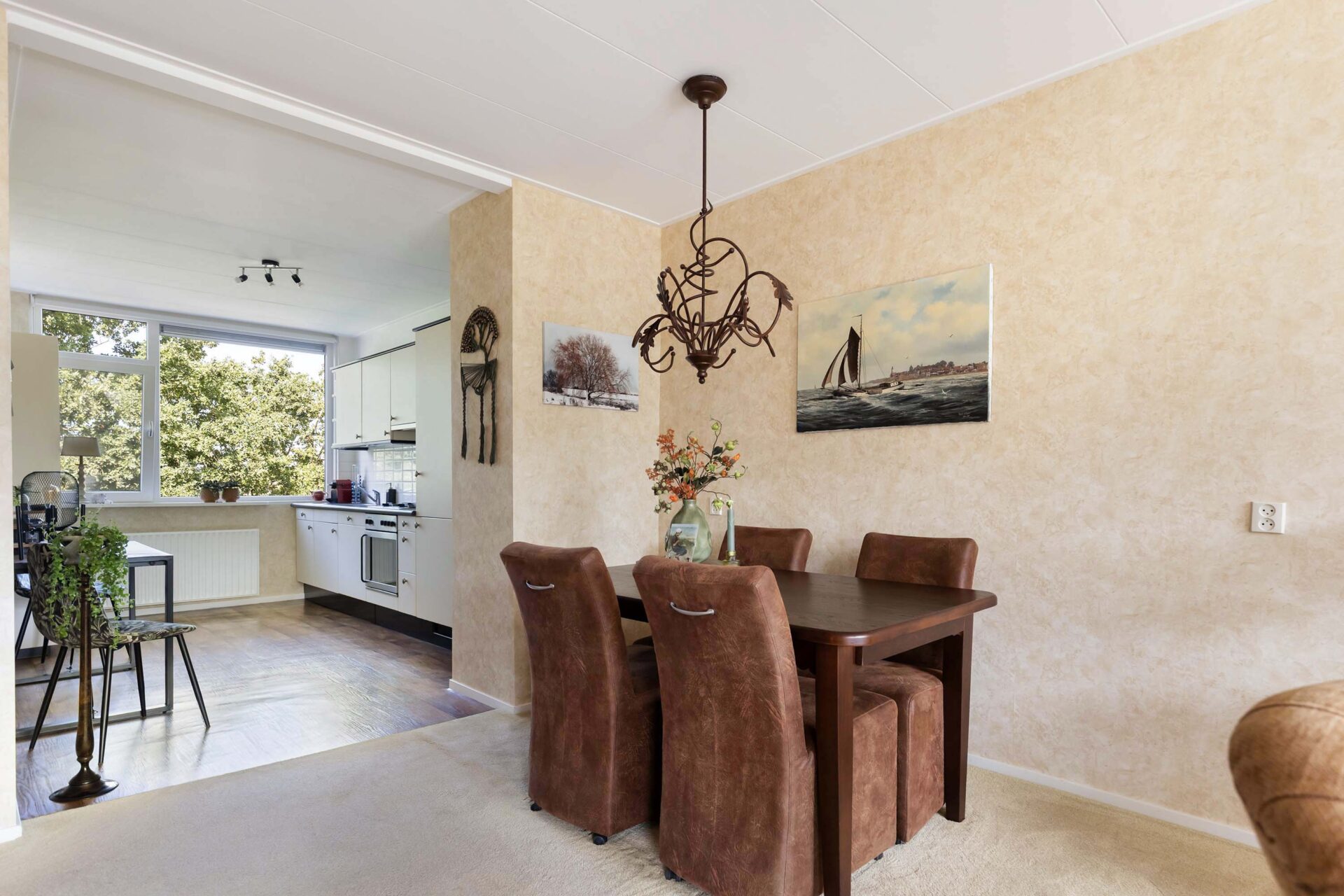 De woonkamer is licht en ruim, mede dankzij het extra zijraam, en biedt toegang tot een balkon van ca. 7 m² op het oosten met zonwering.