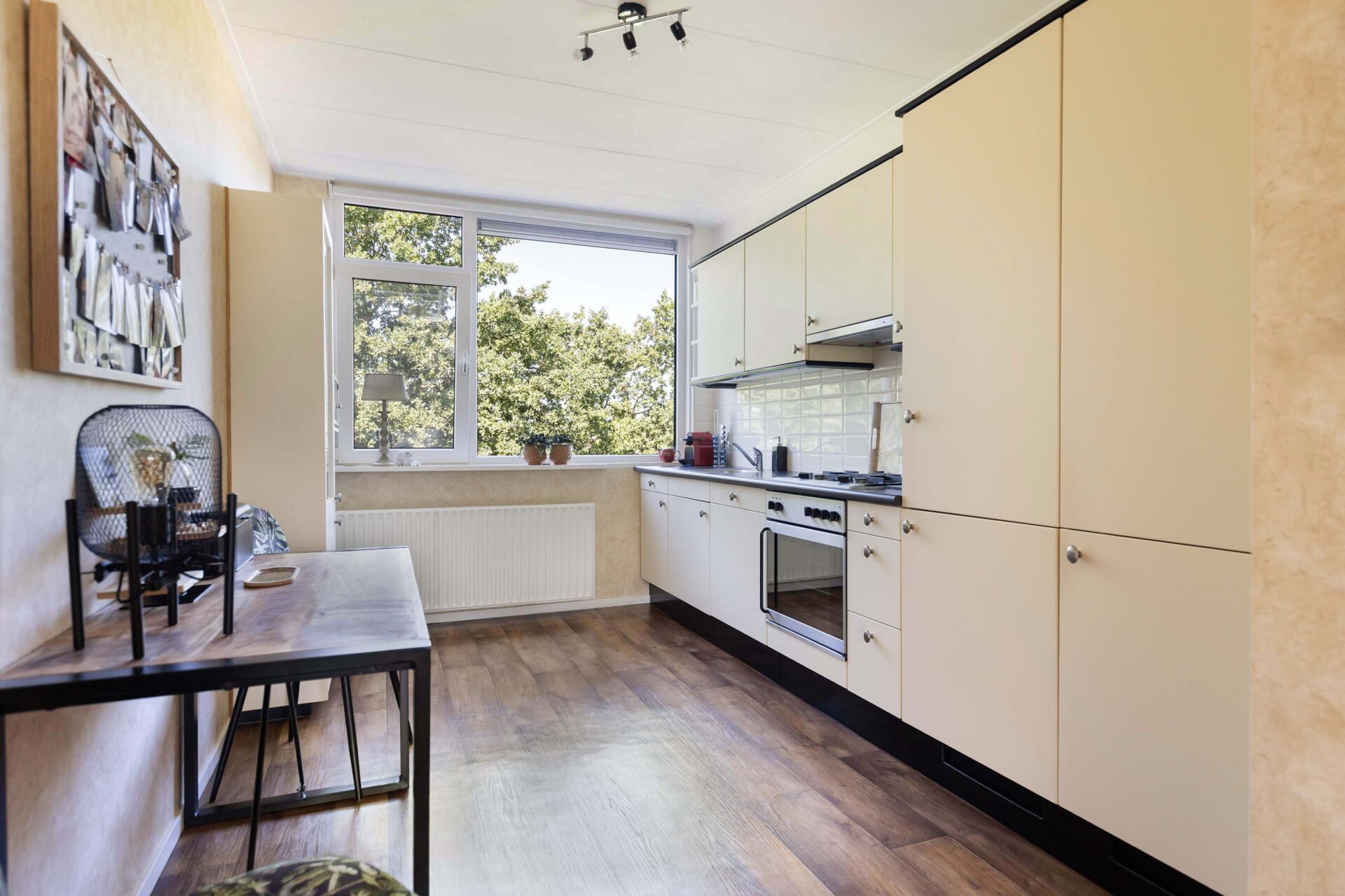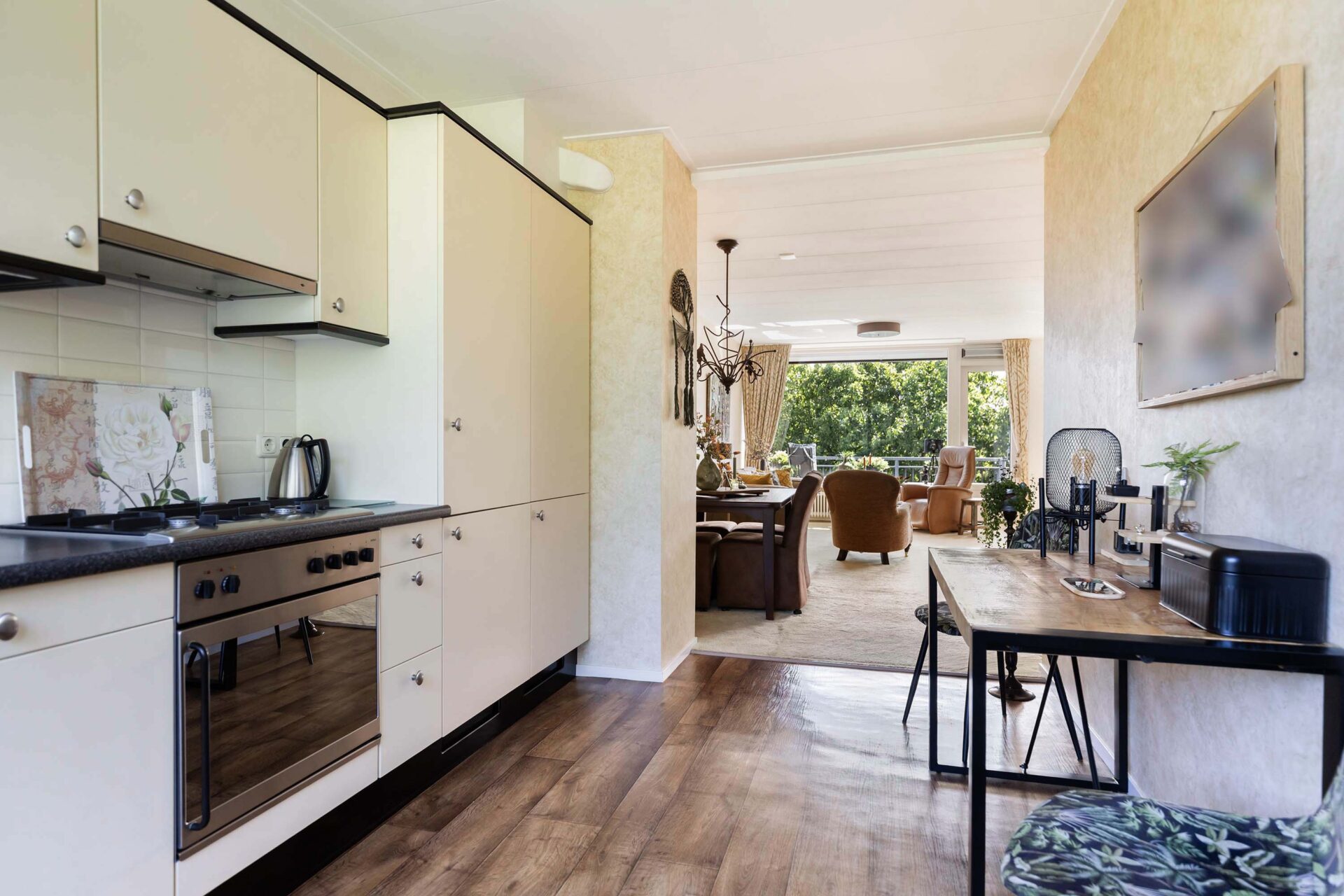 De open keuken sluit aan op de woonkamer en is uitgevoerd met een koel-/vriescombinatie, vaatwasser, 4-pits gasstel, oven en voldoende opbergruimte. De cv-ketel is netjes in een kast in de keuken geïntegreerd.