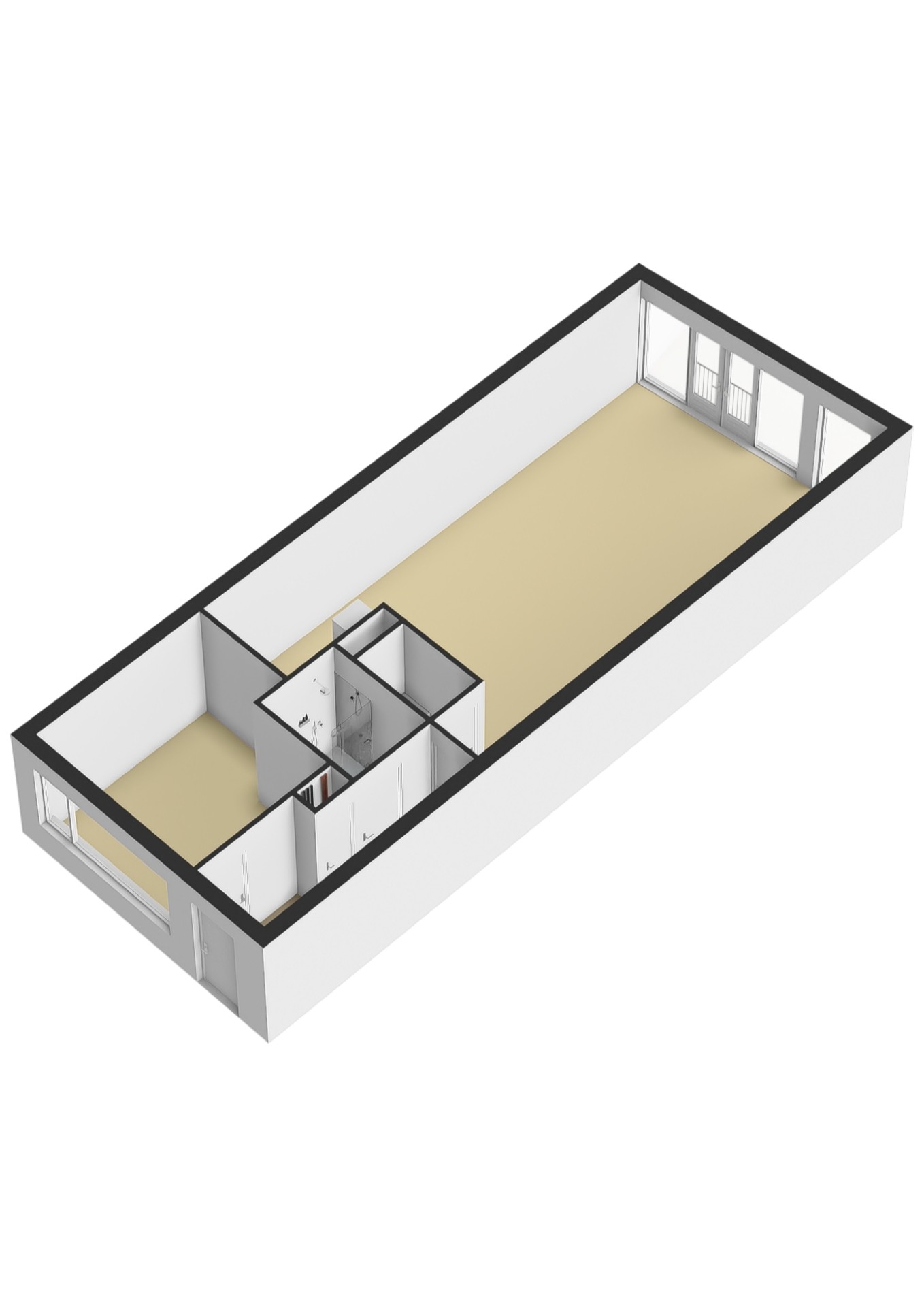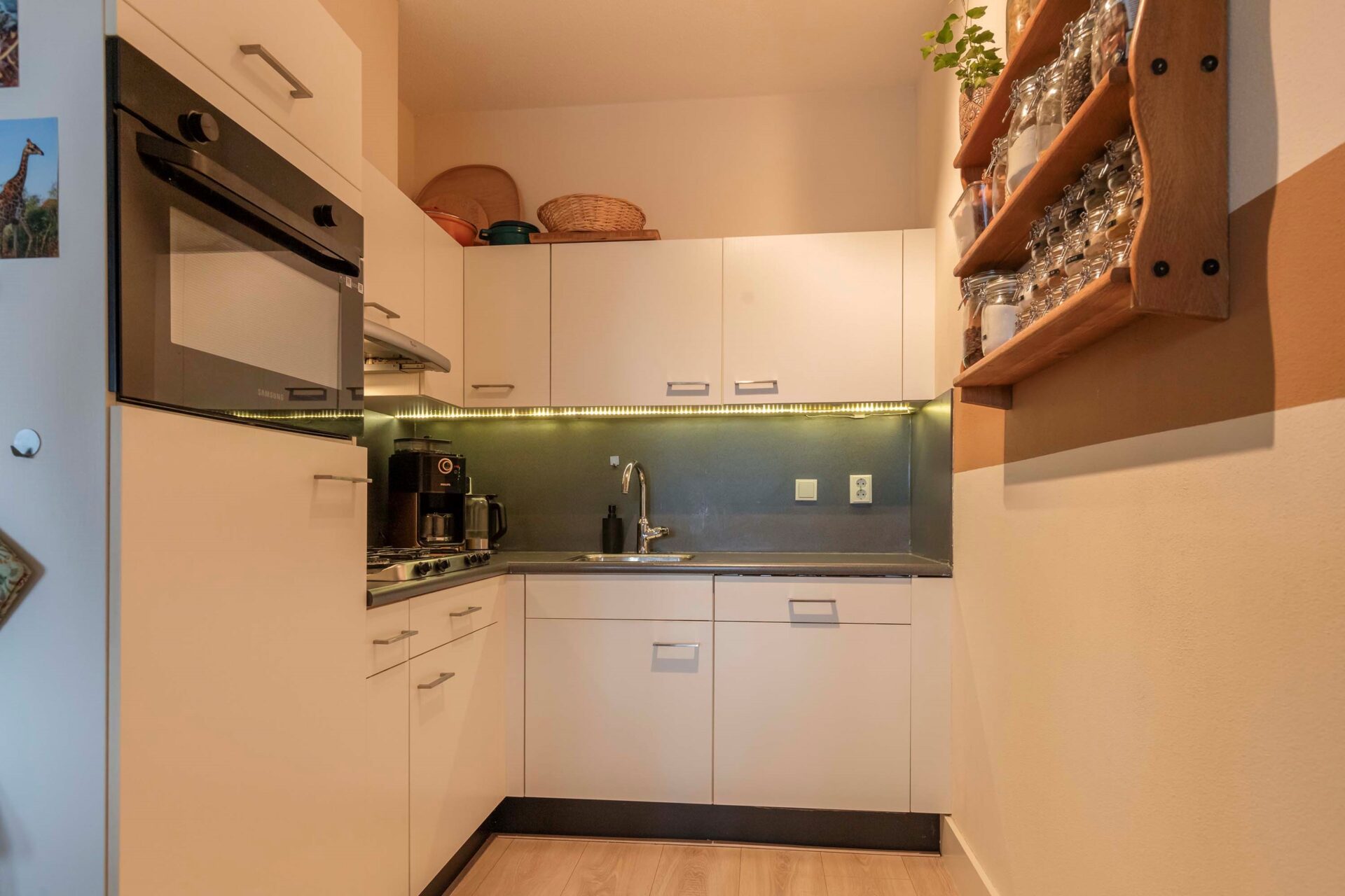 Entree / ruime hal, toegang tot de woonkamer. Dit appartement is voorzien van een royaal formaat woonkamer (circa 10 meter lang, het grotere type in dit complex). De grote raampartijen geven een prettige lichtinval en er is een frans balkon aan de voorzijde. Half open keuken in hoekopstelling voorzien van diverse inbouwapparatuur. De licht betegelde badkamer is gemoderniseerd en is voorzien van douchecabine, wastafelmeubel en vrij hangend toilet. Ruime slaapkamer aan de galerij/atrium zijde van het appartement. Het gehele appartement is voorzien van een fraaie en lichte laminaatvloer.
