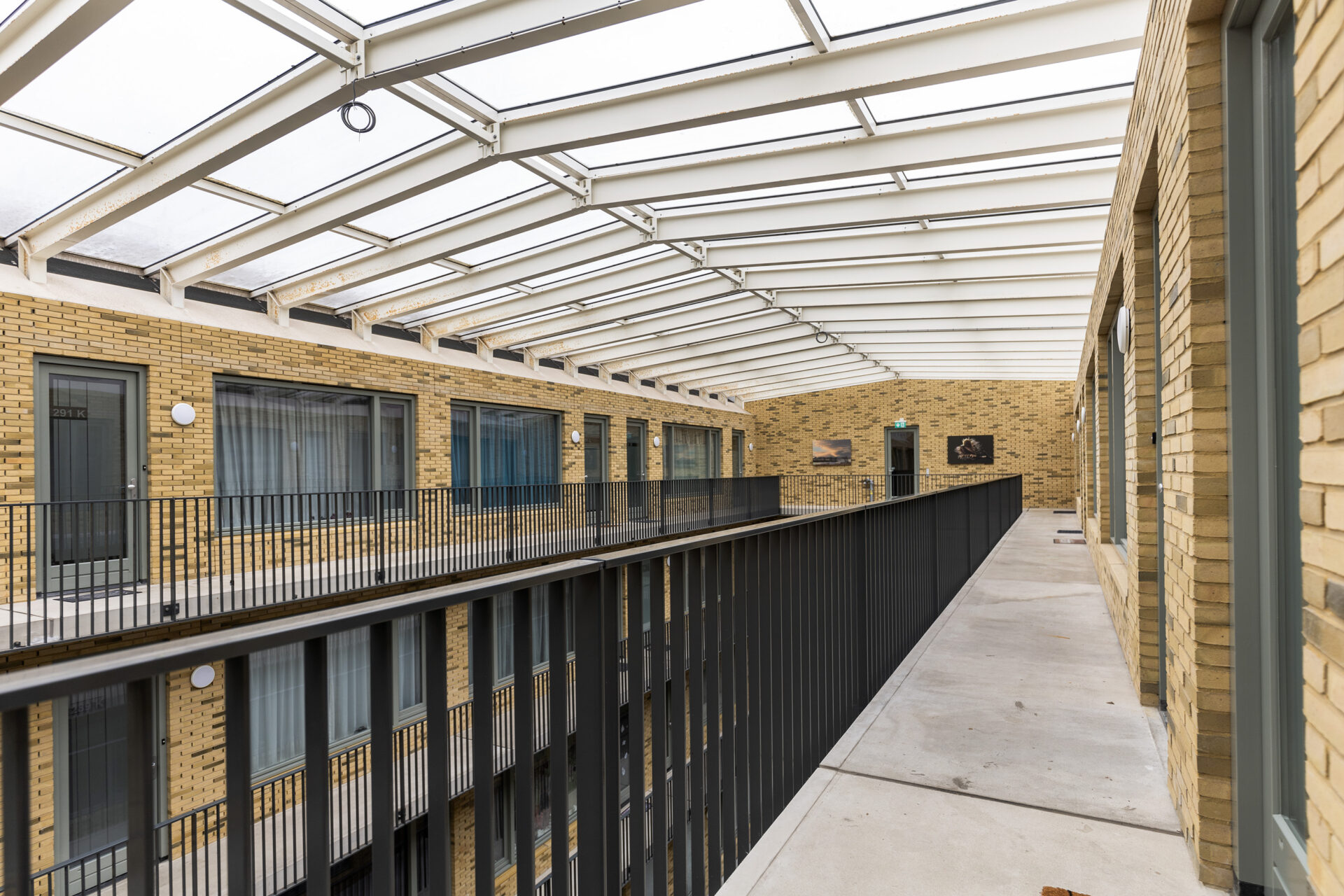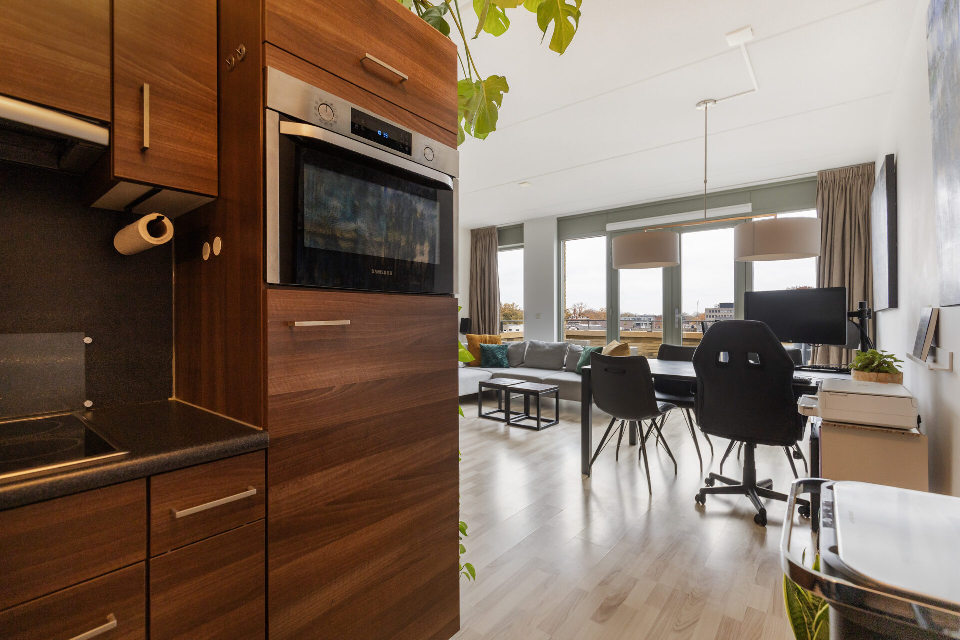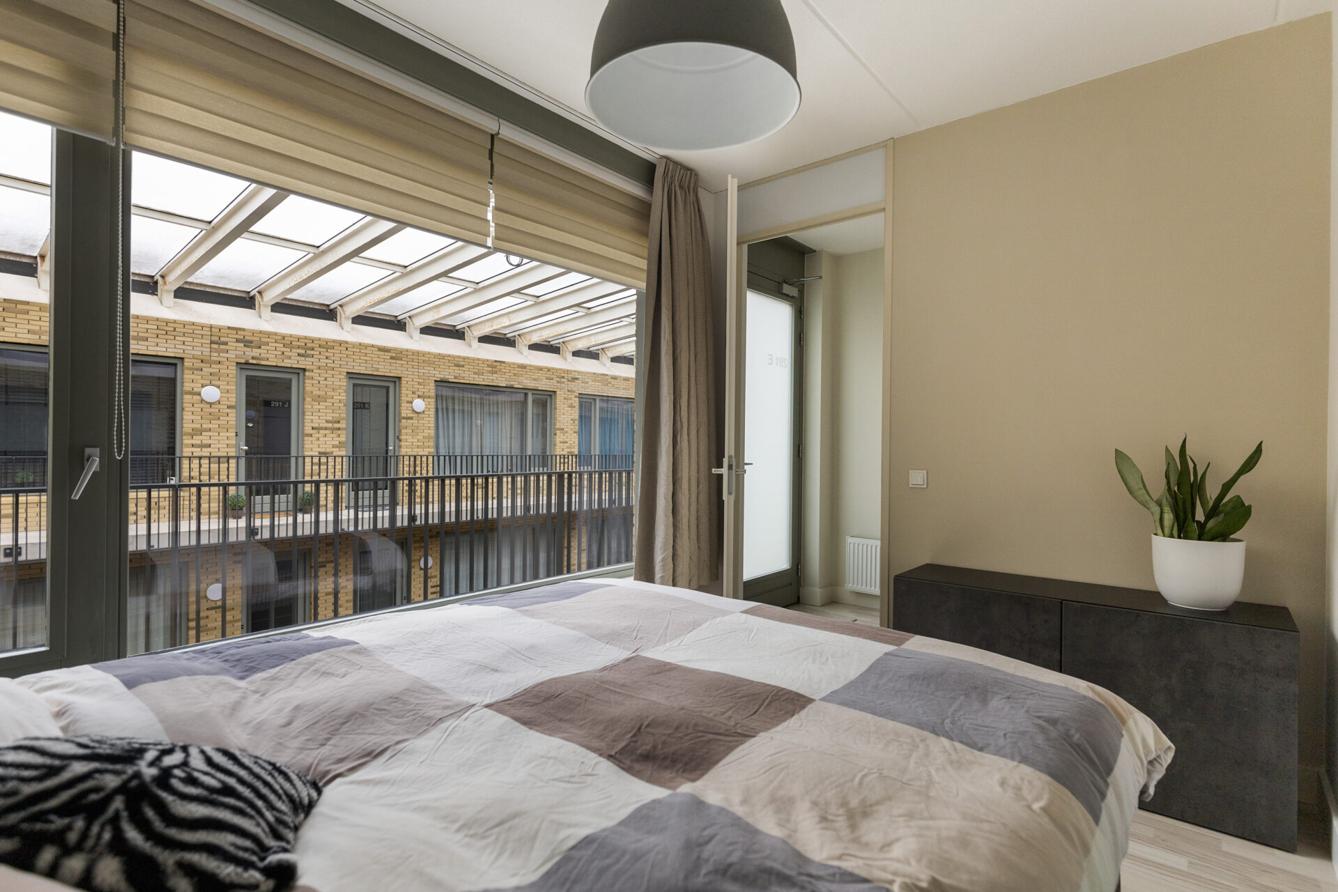Entree / ruime hal, toegang tot diverse vertrekken. De woonkamer is gelegen aan de voorzijde richting het grote dakterras. De woonkamer is fijn en praktisch van formaat. De grote raampartijen geven een prettige lichtinval en via openslaande deuren is het zeer ruime dakterras bereikbaar. Half open moderne keuken in hoekopstelling voorzien van diverse inbouwapparatuur. Vanuit de woonkamer is een inpandige berging bereikbaar met o.a. de C.V.-ketel opstelling en opslagmogelijkheden. De licht betegelde badkamer is modern en praktisch ingericht, voorzien van douchecabine, wastafelmeubel en toilet. Ruime slaapkamer aan de galerij/atrium zijde van het appartement. De slaapkamer is voorzien van een ruime inbouwkast.