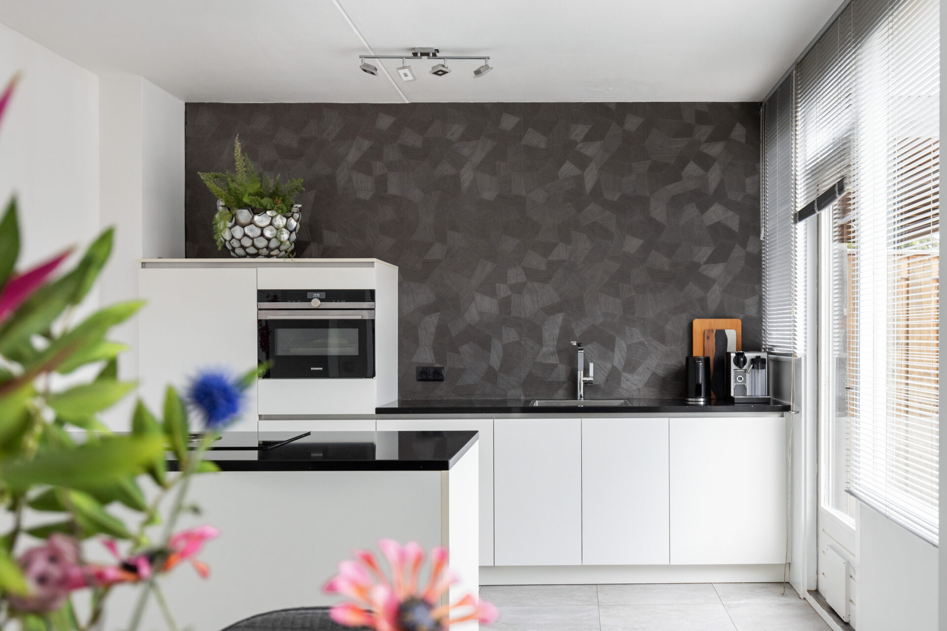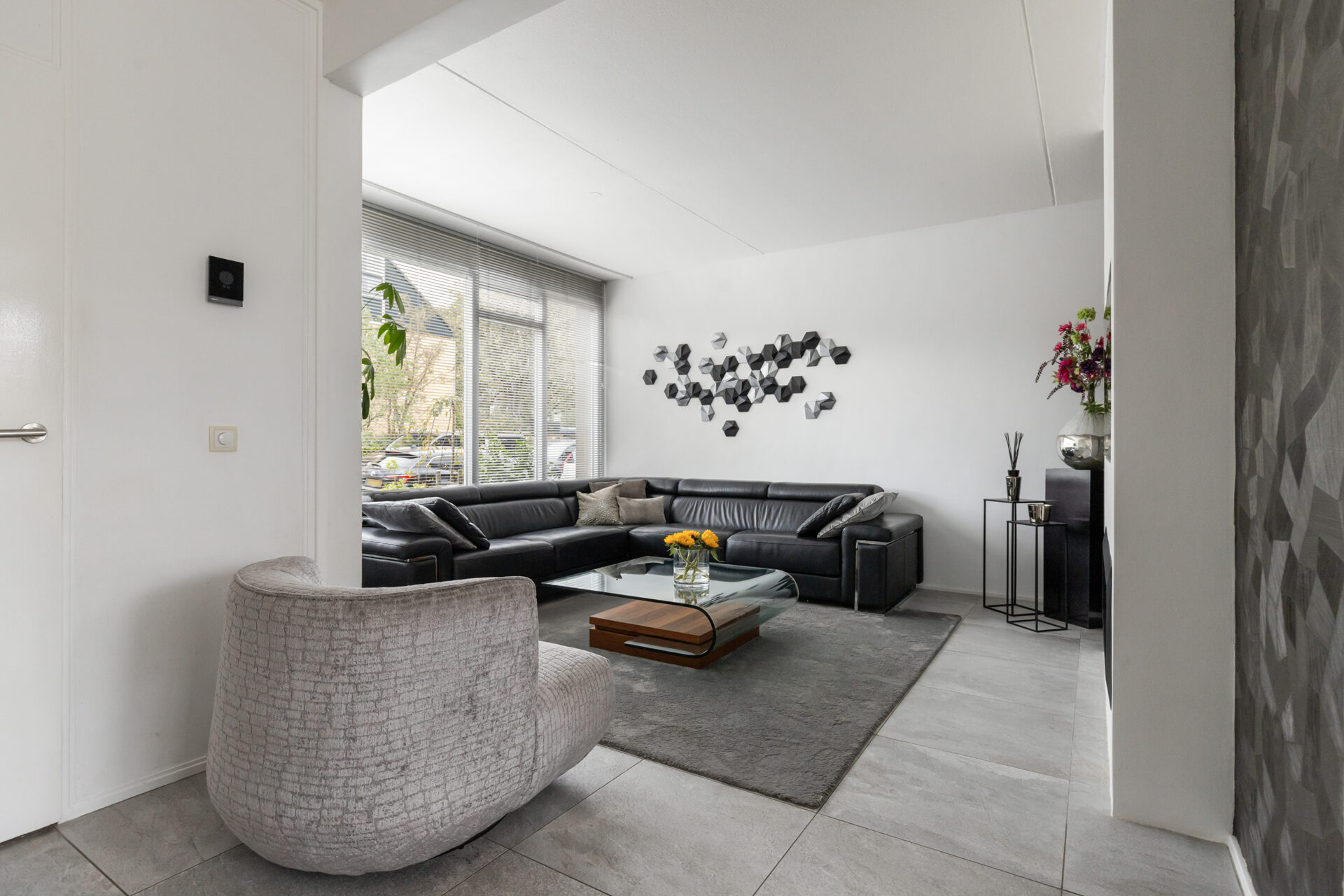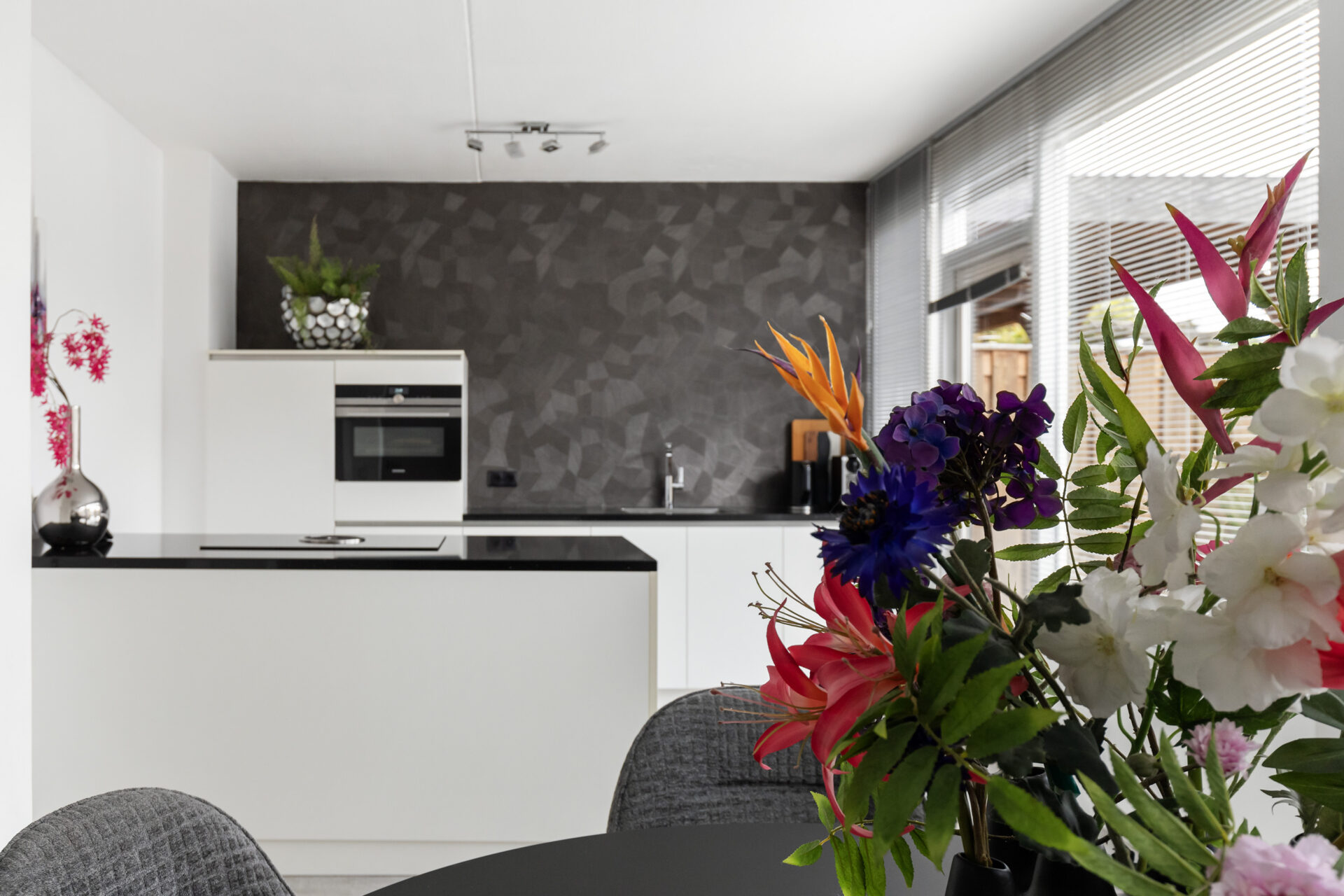Begane grond: entree/tochtportaal met toegang tot het moderne (zwevend) toilet met fontein. Garderobe ruimte en meterkast. Vanuit de entree is de royale woonkamer en open woonkeuken bereikbaar. Wat hier direct opvalt is het ruimtelijke effect en lichtinval. De begane grond is voorzien van een neutrale tegelvloer gecombineerd met vloerverwarming. De woonkamer is aan de voorzijde gelegen en de open keuken aan de achterzijde. De keuken is geplaatst in een recht stuk met een schiereiland. Het betreft een mooie neutrale, lichte en moderne keuken voorzien van diverse inbouwapparatuur. Naast de keuken is er veel ruimte om heerlijk te kunnen tafelen.