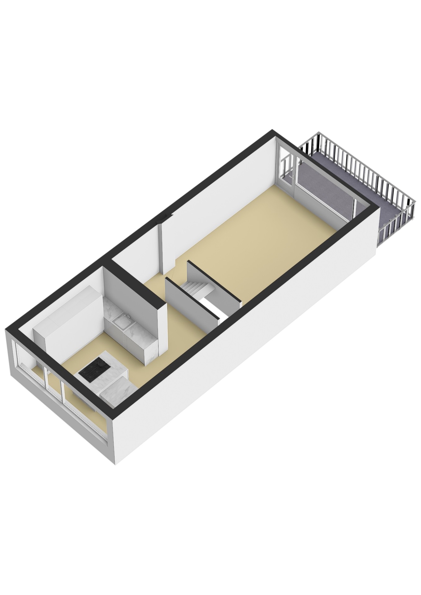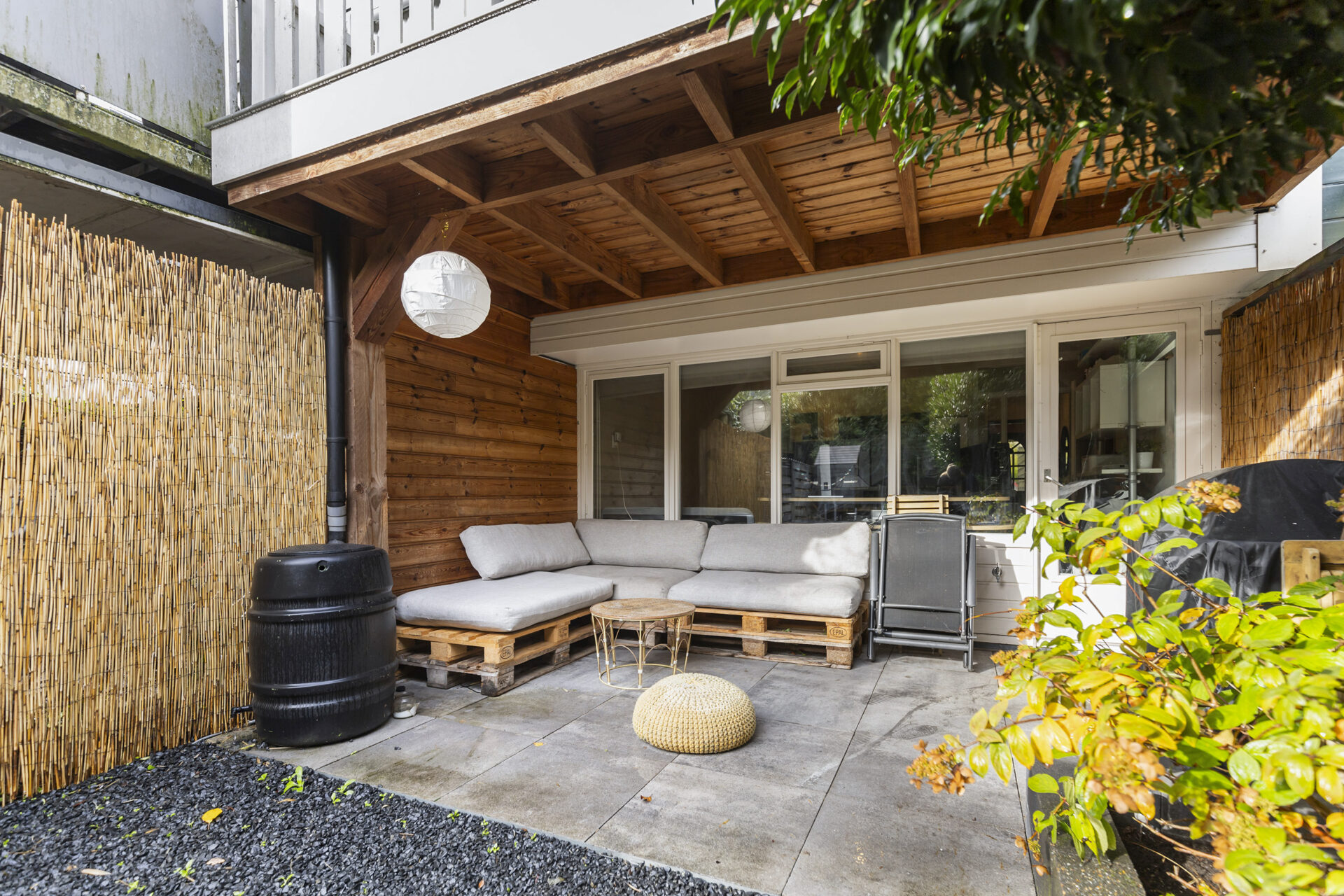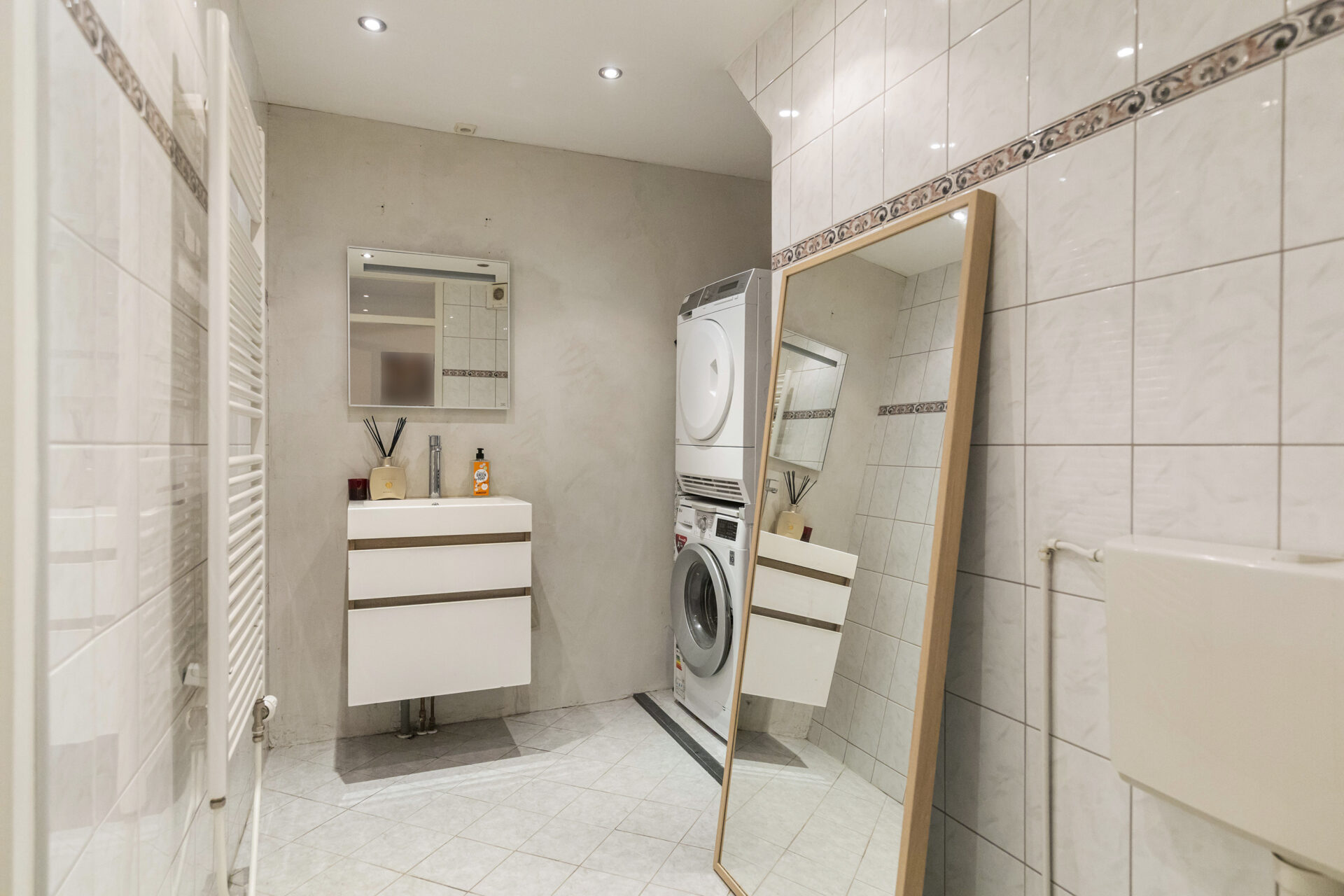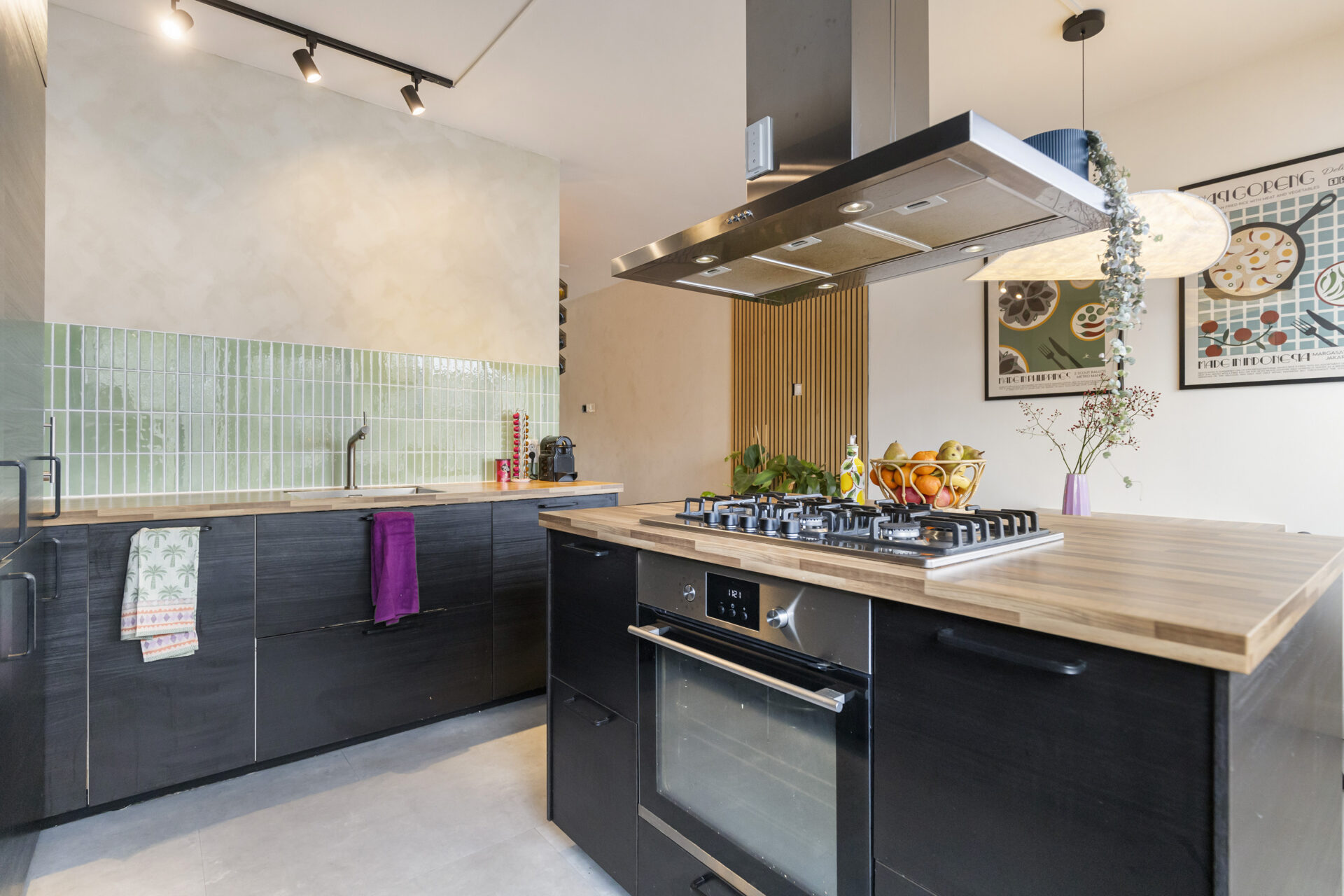 Een lichte, royale woonkamer met grote ramen en toegang tot het zonnige balkon aan de achterzijde. De moderne open keuken is voorzien van diverse inbouwapparatuur en vormt het gezellige hart van deze verdieping.