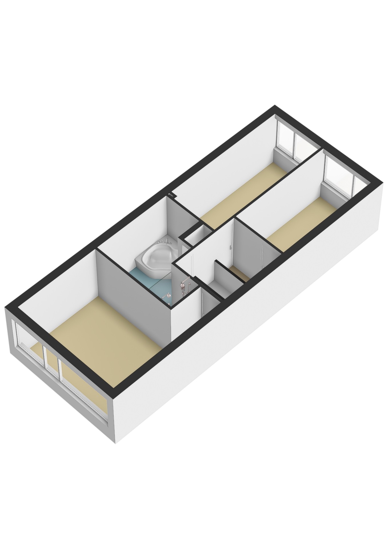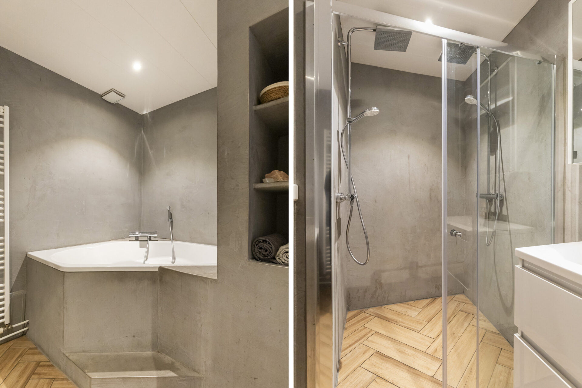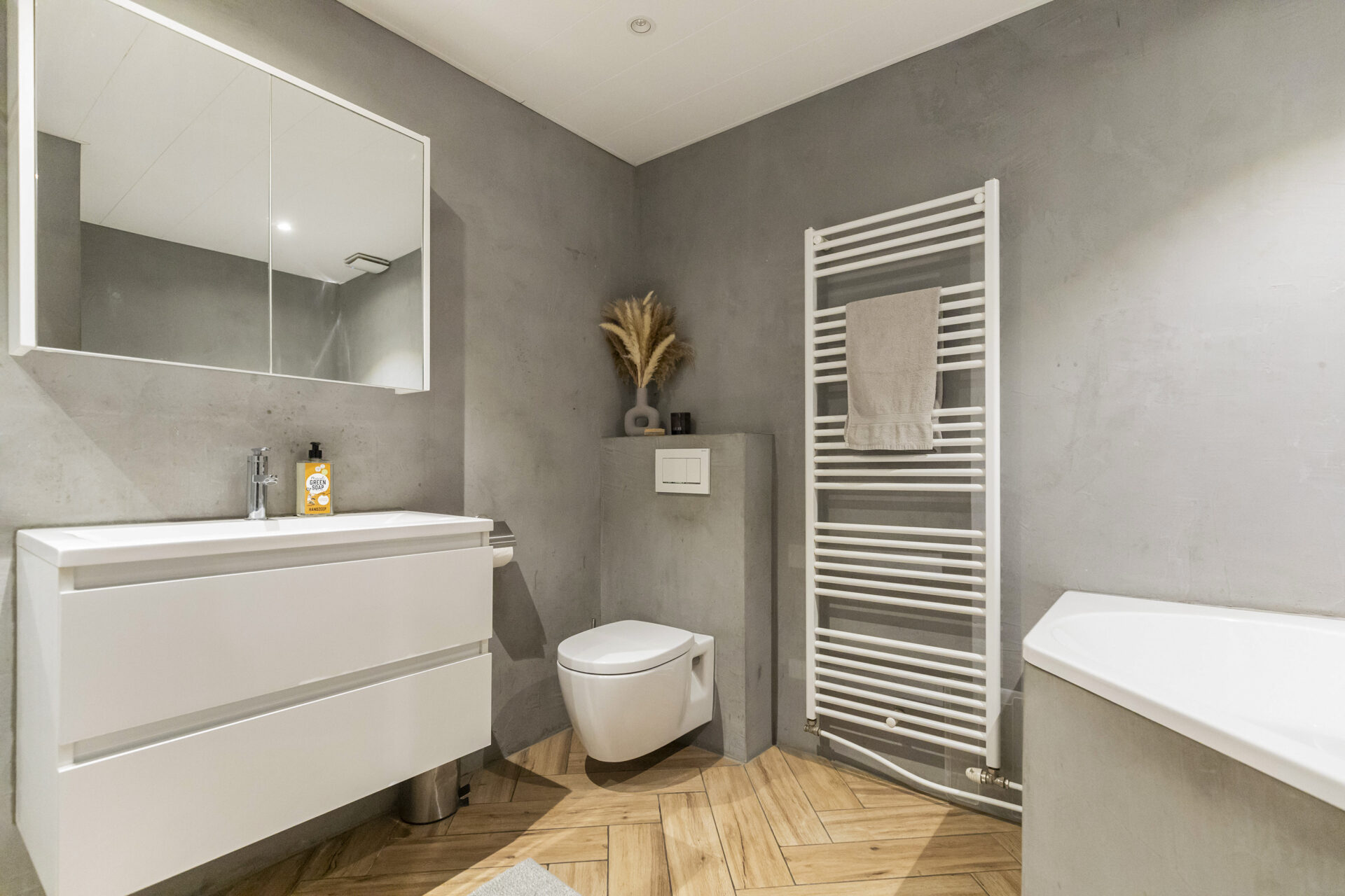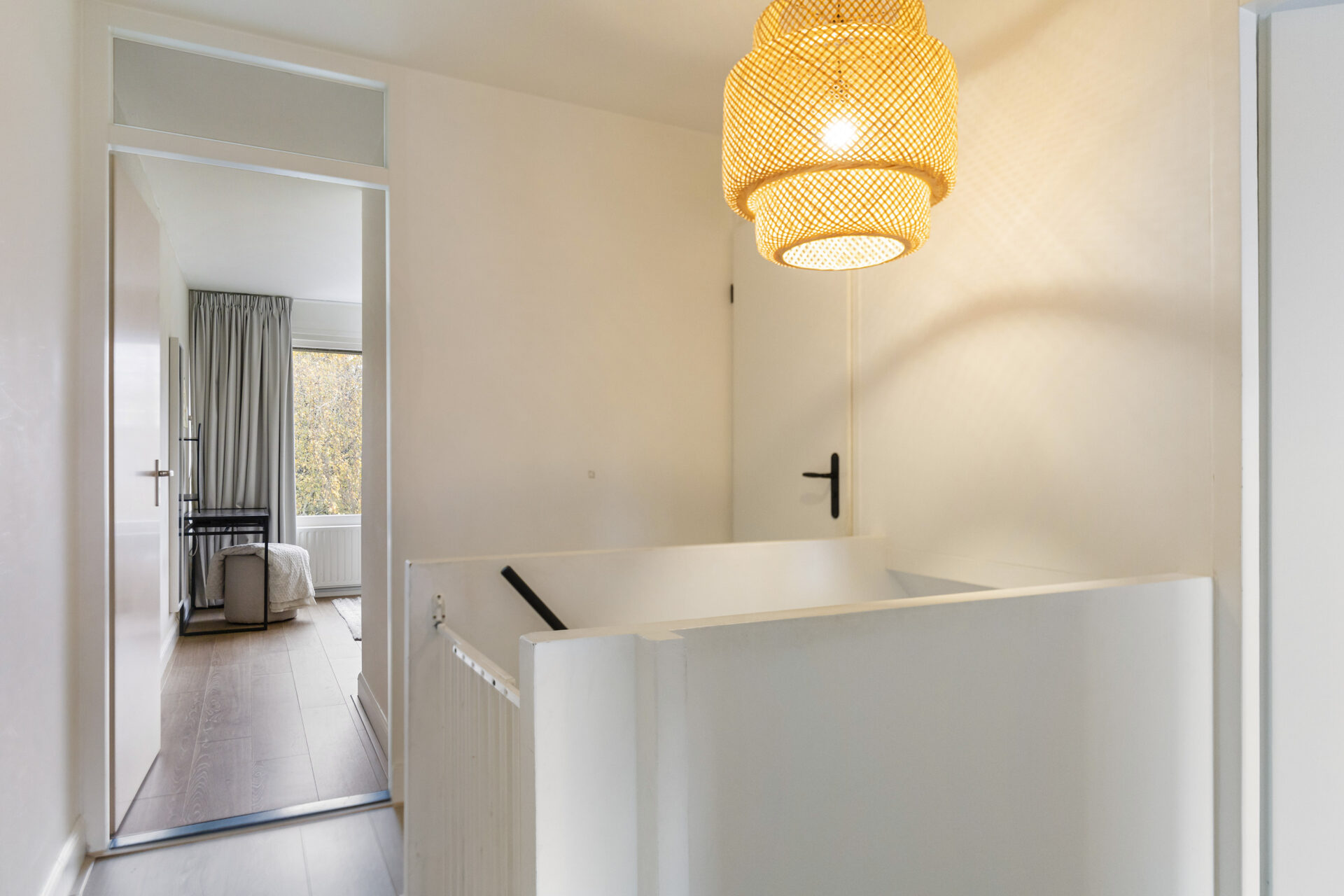 Overloop, drie fraai afgewerkte slaapkamers en een stijlvolle badkamer met inloopdouche, hangtoilet, wastafelmeubel en een comfortabel zitbad.