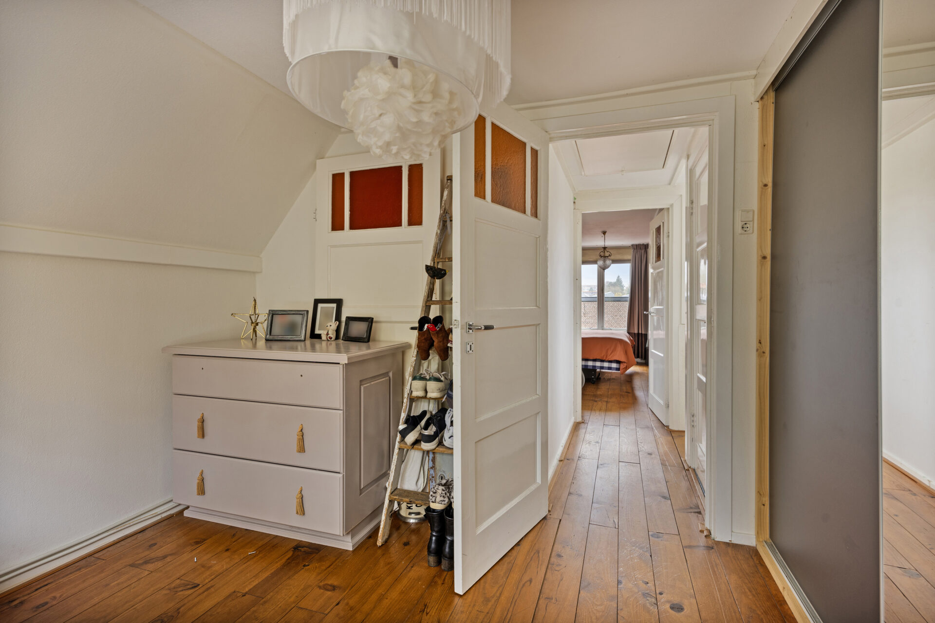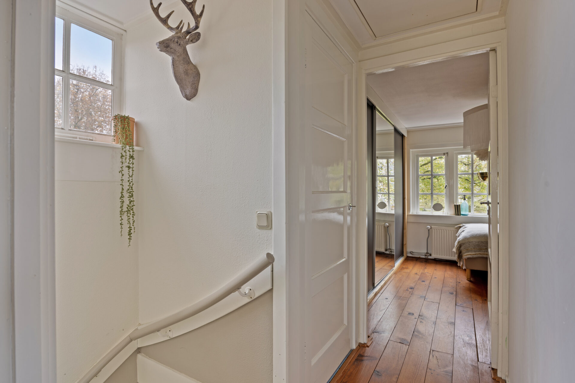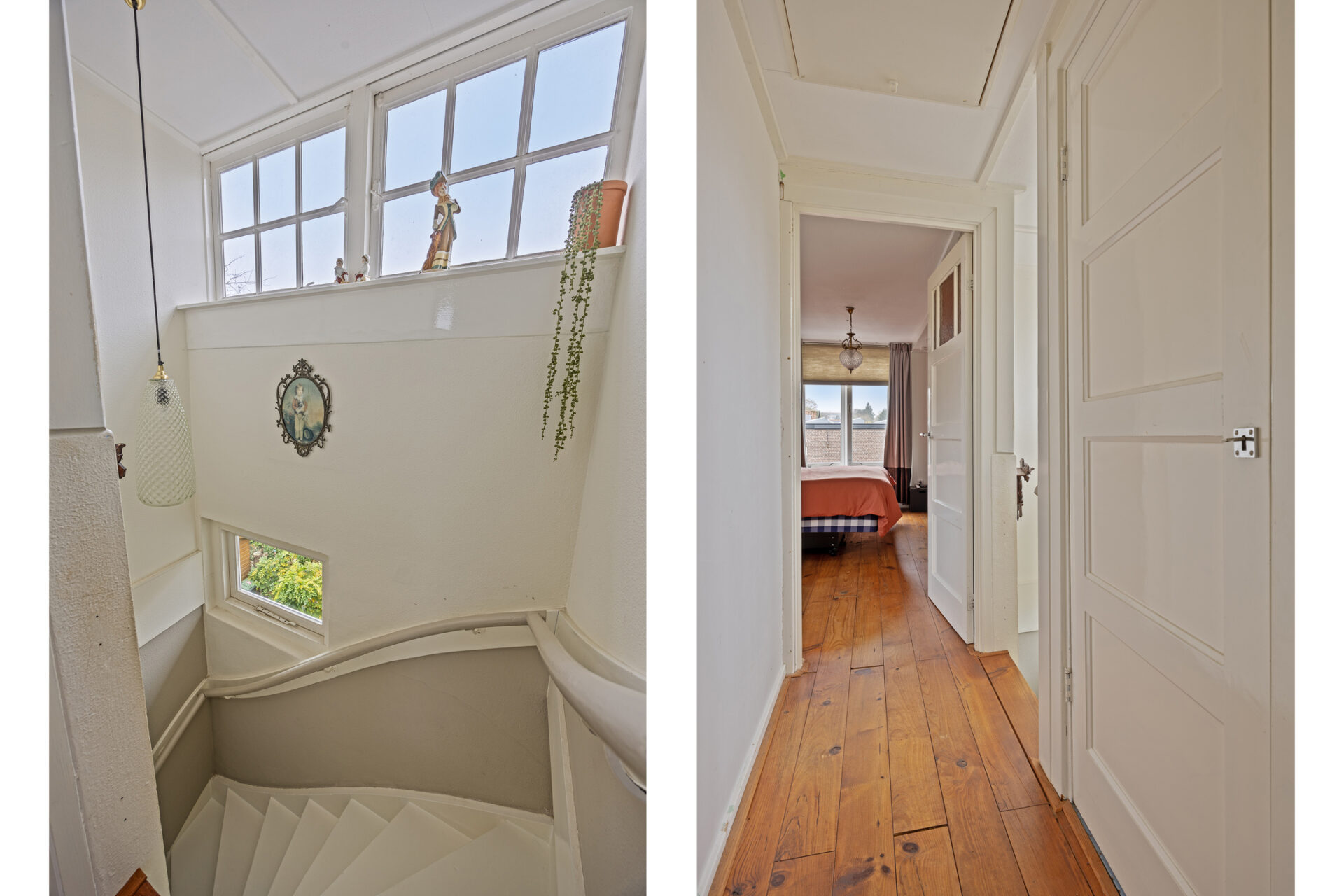 Overloop met toegang tot het dakterras via dubbele deuren, een separate toiletruimte en een sfeervolle woonkamer met karakteristieke glas-in-loodramen.