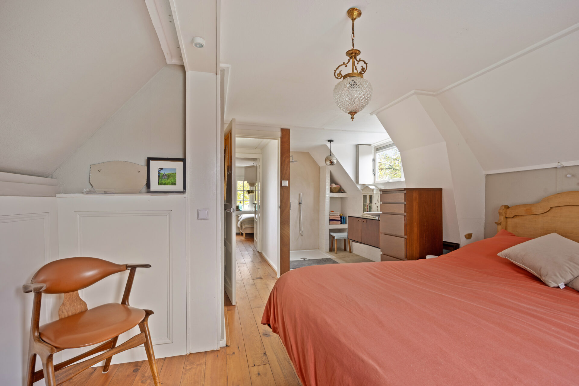 Overloop met berging en twee ruime slaapkamers. De slaapkamer aan de voorzijde beschikt over inbouwkasten. De master bedroom aan de achterzijde heeft een en-suite badkamer met inloopdouche en een ruim wastafelmeubel.