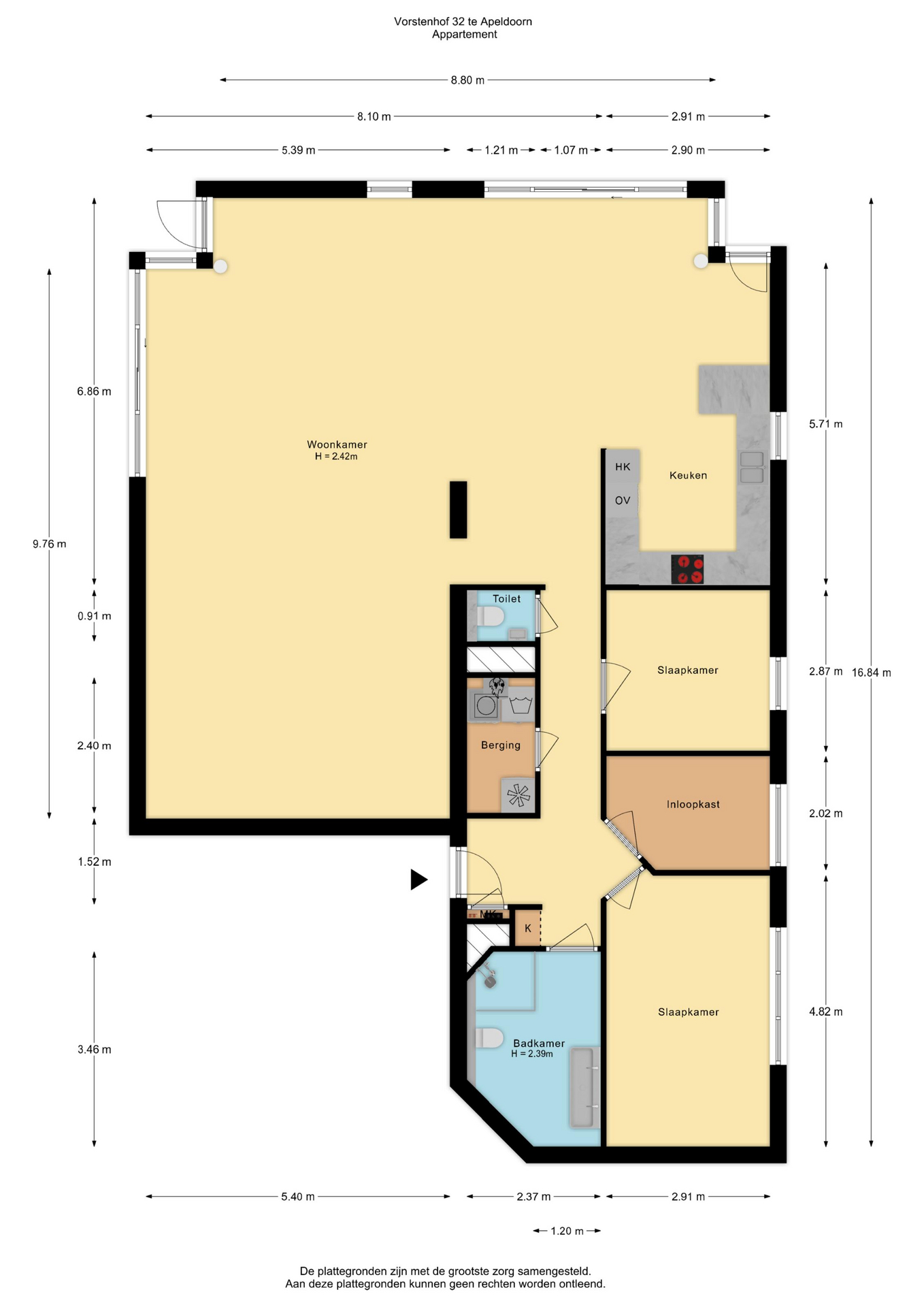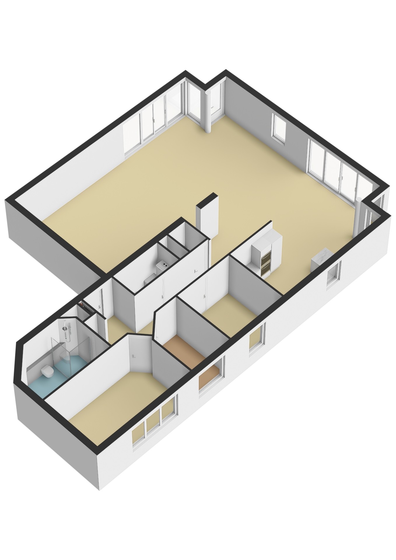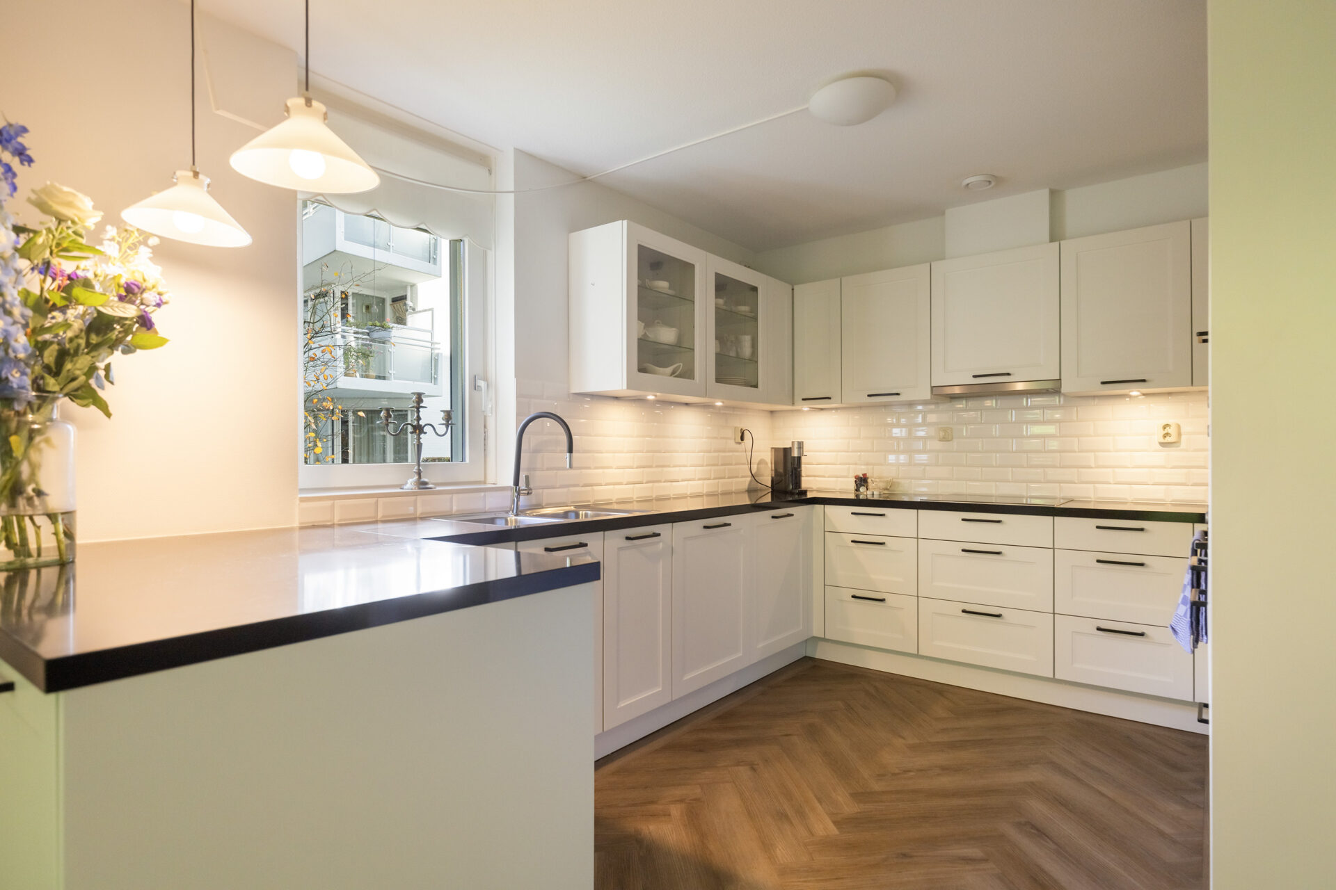 Entree/hal, moderne badkamer, drie slaapkamers, wasruimte, toilet, ruime L-vormige woonkamer met moderne keuken.