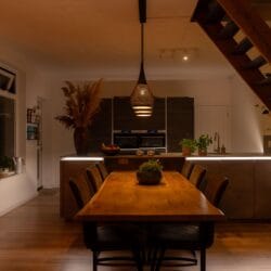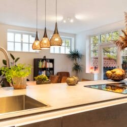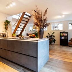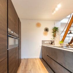 De moderne en luxe open keuken is voorzien van alle benodigde inbouwapparatuur (inductie kookplaat met afzuiging, oven/magnetron combi. oven/stoomoven combi, koelkast, vriezer en vaatwasser). Geplaatst in moderne kleurstellingen, greep loze kasten/lades en voorzien van diverse verlichtingen. De keuken is zo ontworpen dat er een royale eettafel tegen de keuken aan geplaatst kan worden. Zo ontstaat er een fijne interactie tussen de eethoek en de keuken, een echte woonkeuken dus!