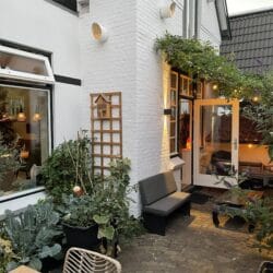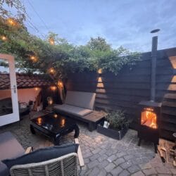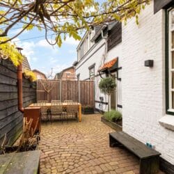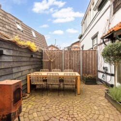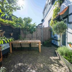 De achtertuin is te bereiken via 2 deuren aan de achterzijde. Het betreft een gezellige stadstuin/patio gelegen op het zuidoosten. Een heerlijk knus plekje om gezellig je dag te starten met een kop koffie in de ochtend zon.
