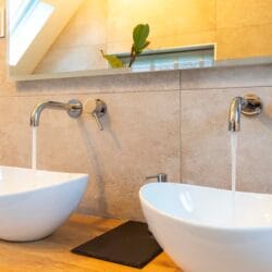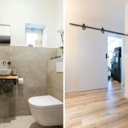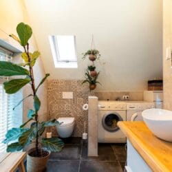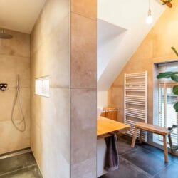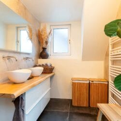 De badkamer is aan de slaapkamer gelegen en is luxe en modern afgewerkt. Voorzien van ruime inloopdouche, fraaie dubbele wastafel meubel, modern zwevend toilet en de opstelling voor de wasmachine en/of droger.