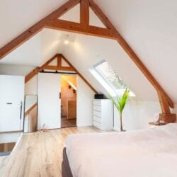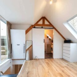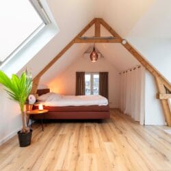 1e verdieping: via de open trap in de woonkamer is de 1e verdieping te bereiken. Deze is overigens af te sluiten door het geïsoleerde luik te sluiten. Bijzonder leuke en ruime slaapkamer voorzien van groot dakraam en toegang tot het royale dakterras. Het dakterras is gelegen op het zuidwesten. Een heerlijk plekje om in de zwoele zomeravonden nog even heerlijk buiten te zitten.