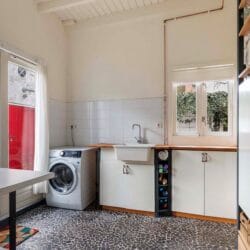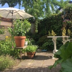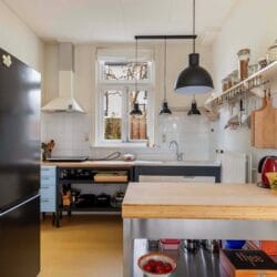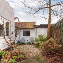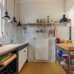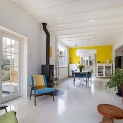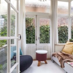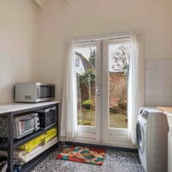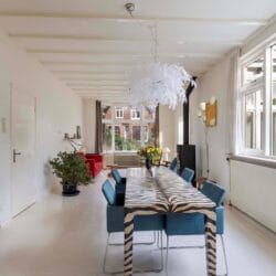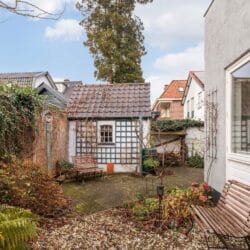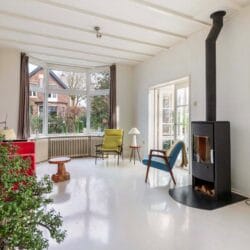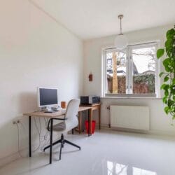 Zeer lichte en royale woonkamer. De gezellige woonkamer is voorzien van een erker aan de voorzijde en een leuke serre aan de zijkant van de woning. De vele raampartijen, hoge plafonds en de lichte kleurstellingen maken deze ruimte heerlijk licht en ruimtelijk. De woonkamer is voorzien van een gezellige houtkachel. De open keuken bevindt zich aan de achterzijde en geeft een prettige connectie naar de eetkamer/hoek. Achter de keuken zit de bijkeuken, een zeer prettige en praktische ruimte. Thans bevindt zich hier de wasmachine aansluiting en is er een spoelbak en kastruimte aanwezig. Zowel vanuit de bijkeuken als vanuit de woonkamer is de werkkamer aan de achterzijde bereikbaar. Ideaal voor iemand die thuis werkt of anderzijds een leuke speelkamer of hobbykamer. Vanuit deze ruimte is het aangebouwde bijgebouw bereikbaar. Ideaal voor diverse doeleinden: kantoor aan huis, atelier aan huis etc. Het betreft een mooie grote ruimte met prettig lichtinval en veel mogelijkheden.