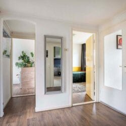 Entree (ruimte voor een garderobe), ruime hal met toegang tot de diverse vertrekken. Aan de linkerzijde de half open keuken gelegen aan de galerijkant. Een frisse en nette keuken in hoekopstelling en deels voorzien van inbouwapparatuur. Ruime en lichte slaapkamer aan de galerijzijde voorzien van een vaste kastenwand. Badkamer inpandig gelegen en voorzien van een bad/douche combinatie, wastafelmeubel en radiator. Royale en lichte woonkamer, zonnig gelegen op het zuiden. De woonkamer is zeer praktisch in te richten met een ruime zithoek en een gezellige eethoek. Het balkon is gelegen aan de woonkamer en geeft een zonnig en rustig uitzicht op de groene omgeving. 2e ruime slaapkamer, reeds voorzien van de wasmachine aansluiting.